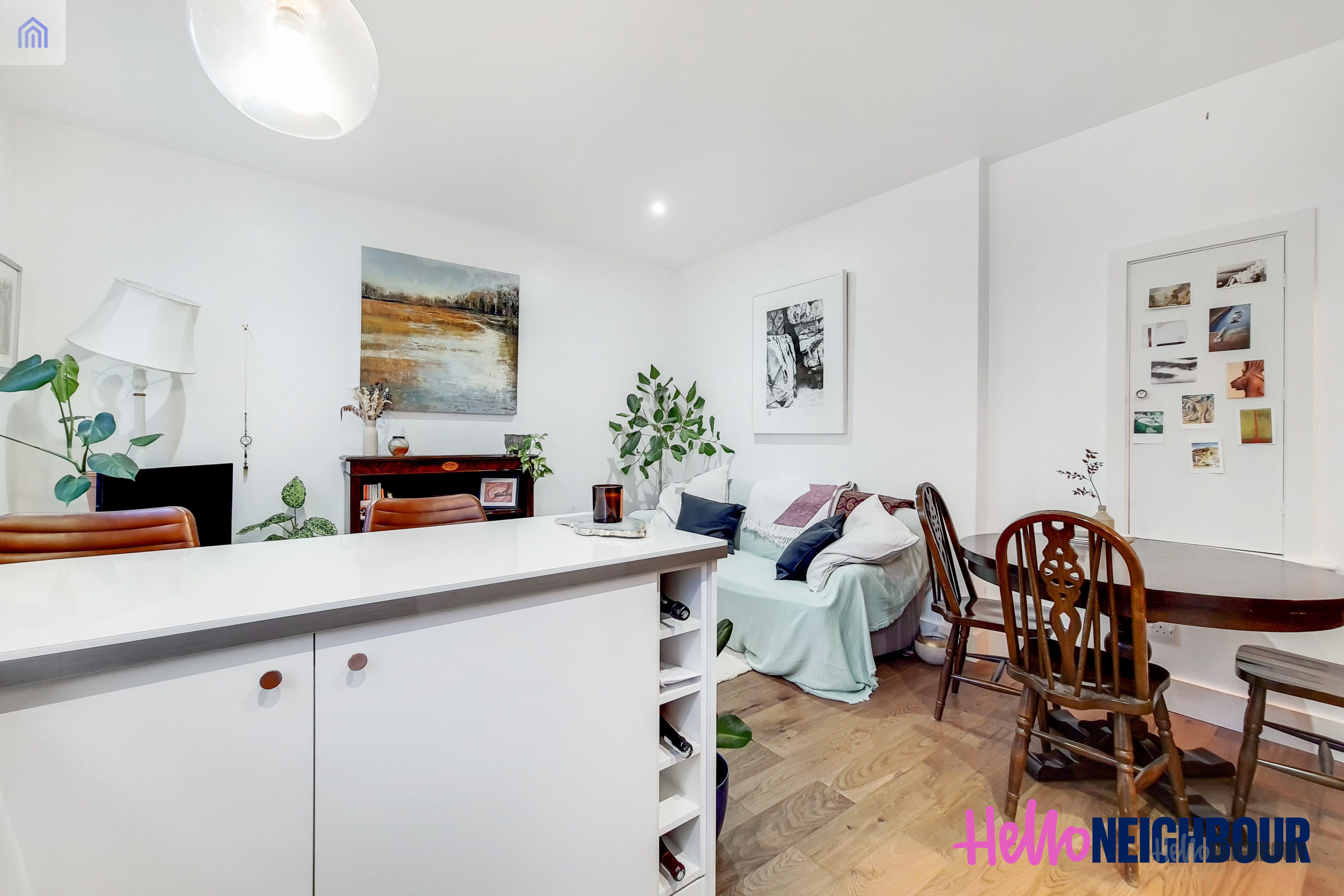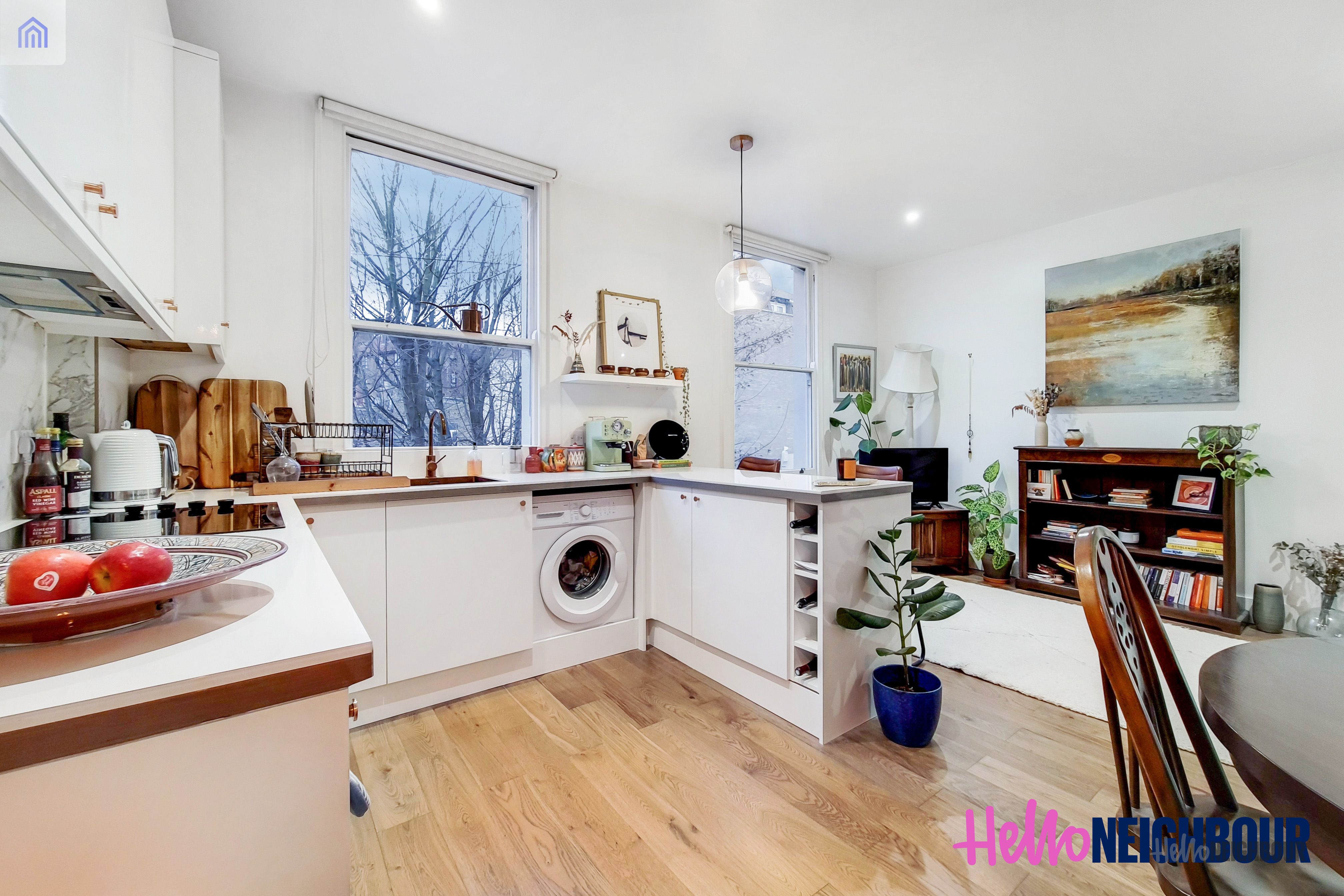Hello Neighbour proudly presents this beautifully designed split level one bedroom flat, perfectly located in Hackney, E5.\n\nSpread across two floors, this bright and stylish home offers a fantastic blend of comfort and modern living. The ground floor features a spacious double bedroom complete with a charming bay window, flooding the room with natural light, and a contemporary 3-piece shower room for added convenience.\n\nUpstairs, you’ll find a light-filled open-plan reception and fully fitted kitchen, complete with integrated appliances and a sleek marble-top breakfast bar — adding a touch of elegance to the space and making it ideal for entertaining or relaxing.\n\nAvailable from 23rd December 2025, the property is offered furnished and finished to a high modern standard throughout. Perfectly situated just a 5-minute walk from Clapton Station, residents will benefit from excellent transport connections, as well as nearby amenities, trendy cafés, and green spaces — making this the perfect home for a professional occupant or couple.\n\nPets: not accepted \nParking: Residents are eligible for residents parking permit via local council