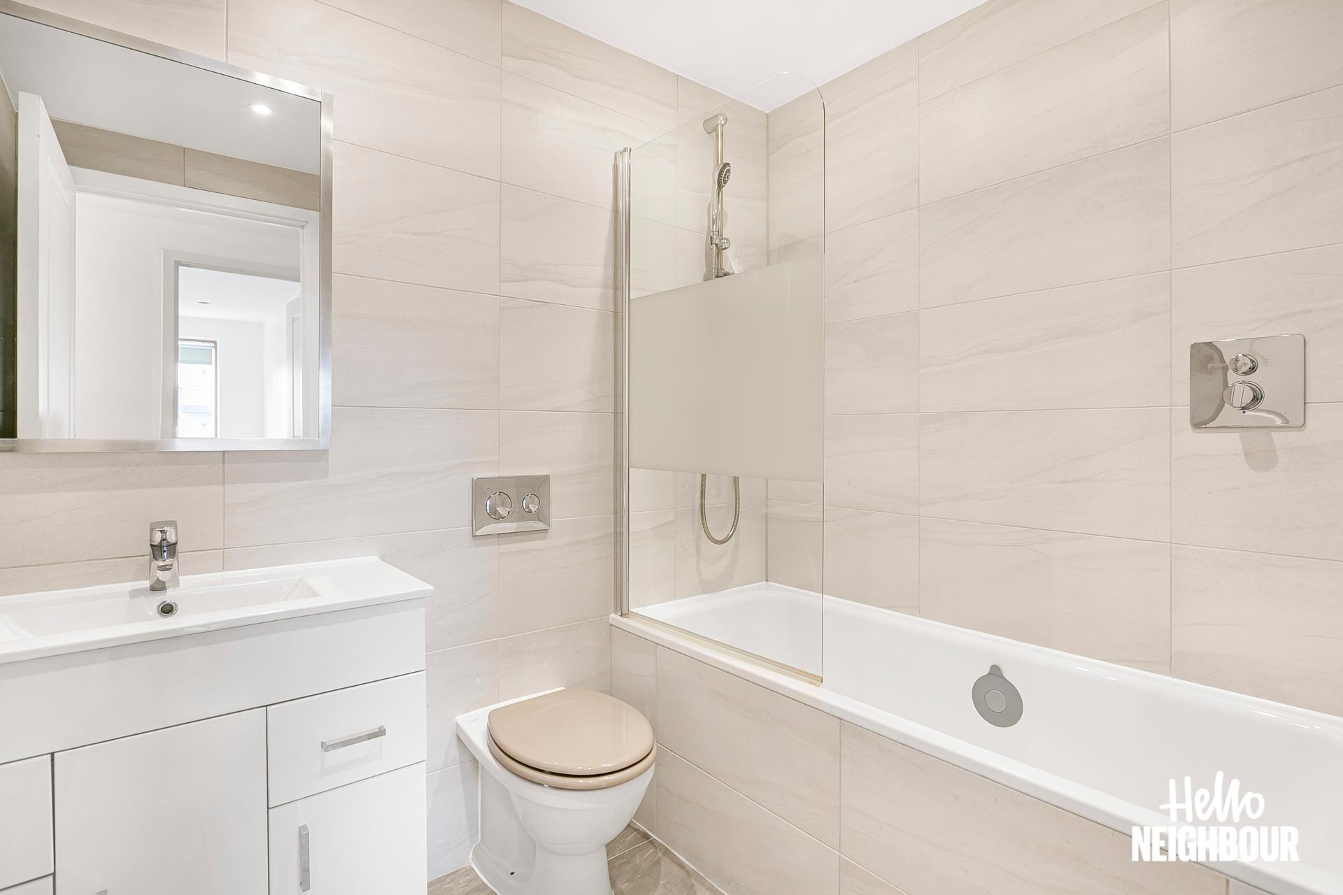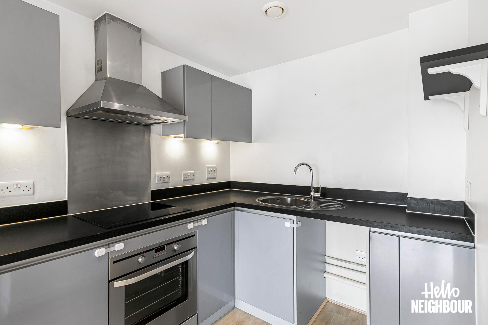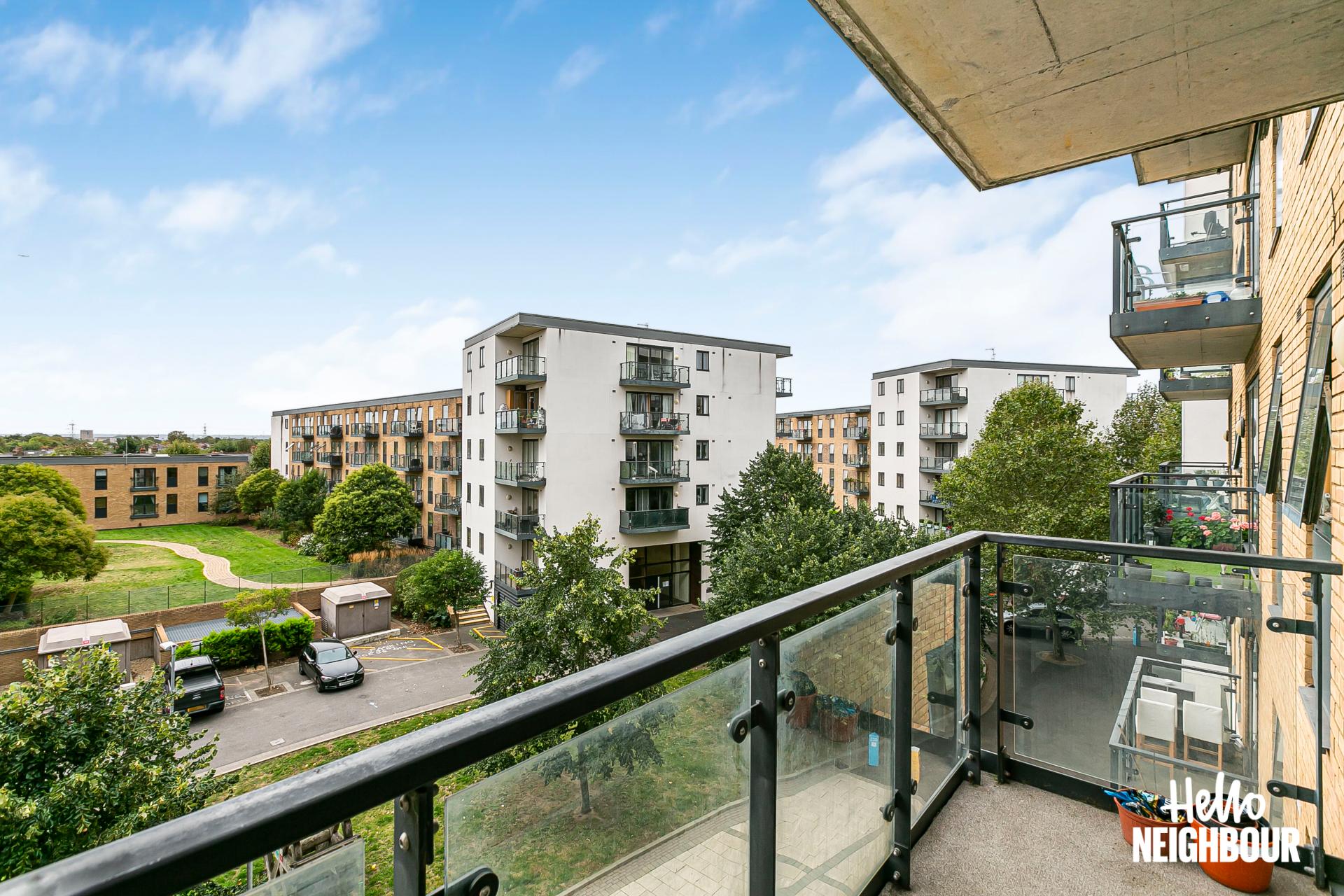 Hello Neighbour are proud to present this delightful 2-bedroom flat in Haydons Road. \n\nThis property features an airy living room with a window wall that fills the space with natural light. The kitchen, sleek in design, offers ample storage options and countertop space, for added ease and organisation within your daily routine. The flat features two well sized bedrooms, each providing a bright and peaceful retreat for a good night’s rest.\nThe private balcony is a terrific feature, ideal for enjoying the fresh air. The two bathrooms, including master en-suite, yields added convenience and privacy to your day to day. \n\nThe property offered unfurnished (just oven and hob) is exceptionally situated just 6 minutes on foot from Haydons Road Station for easy commutes and ventures around the city. There is, in addition, allocated private parking available for added convenience. \n\nPets: sadly not allowed.\nParking: allocated space.