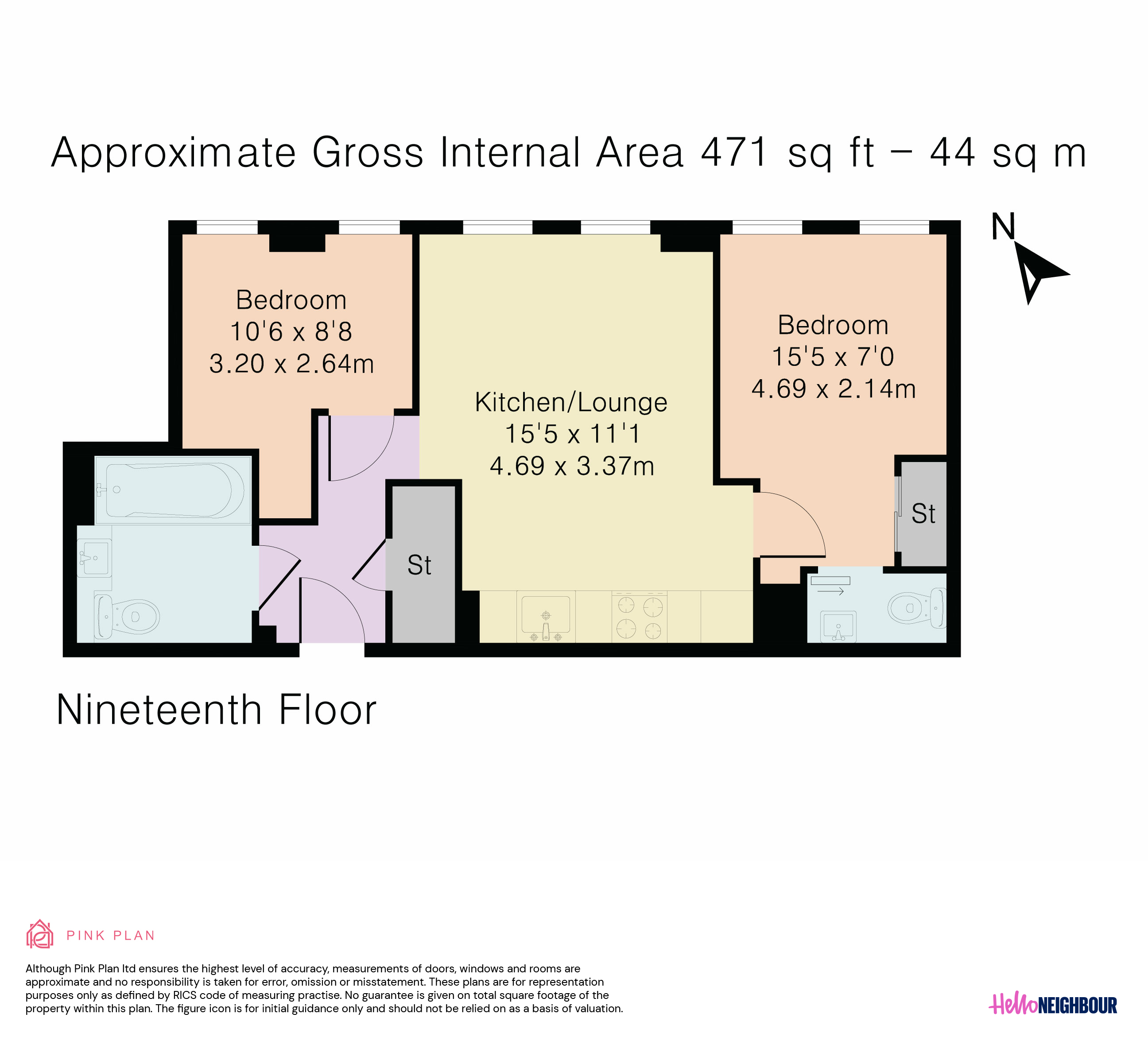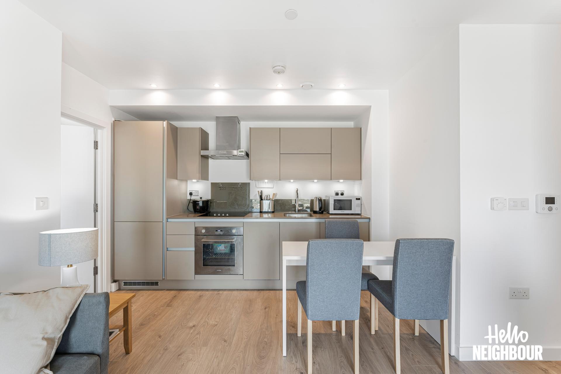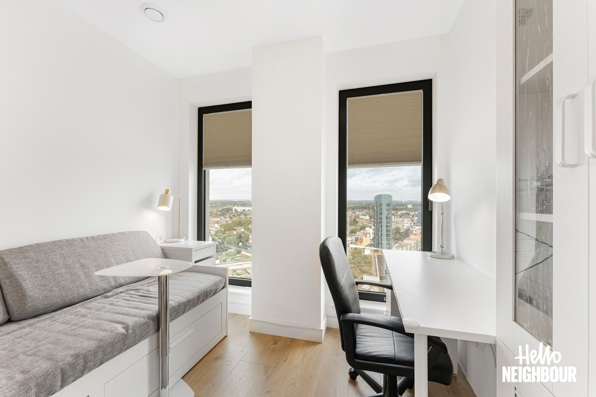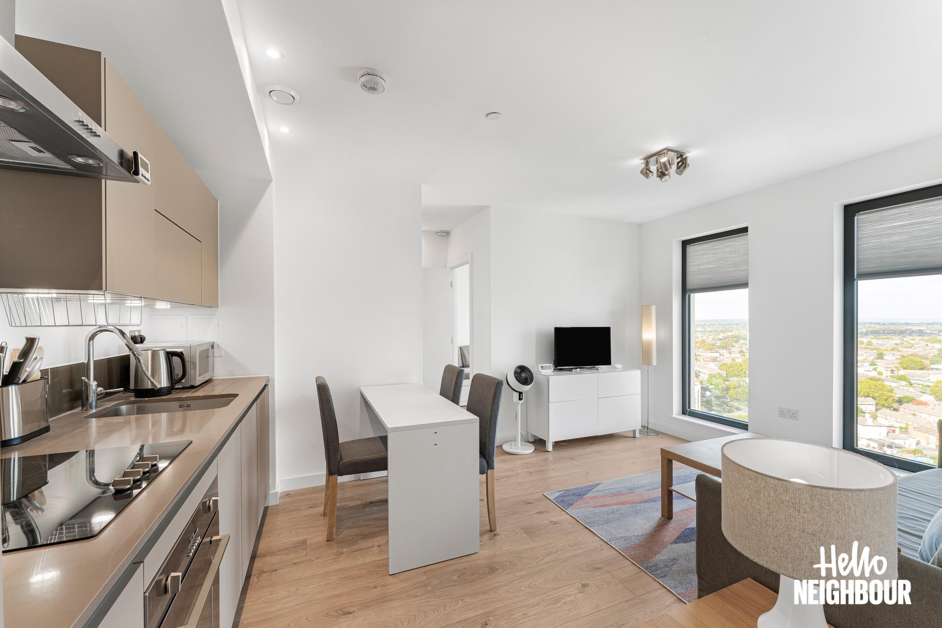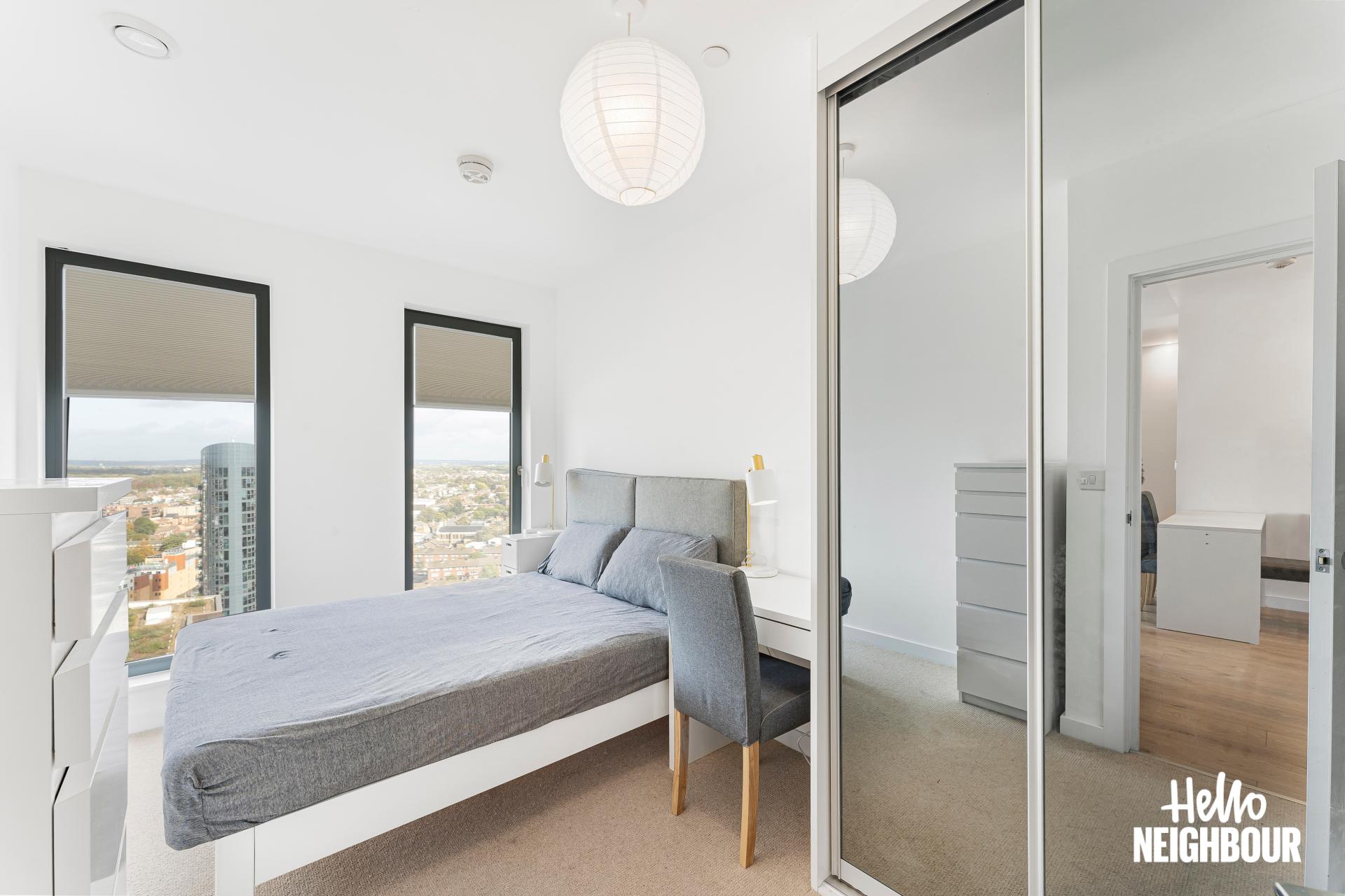 Hello Neighbour are proud to present this gorgeous 2-bedroom flat in Stratford. \n\nThis property comes fully furnished and features a bright and airy living room, with tall windows that fill the space with natural light. The sleek and contemporary kitchen, offers ample storage and countertop space as well as room for dining in. The flat boasts two well sized bedrooms, each offering a bright and comfortable retreat. The two bathrooms, including master en-suite, provides added convenience to your day to day. \n\nThe property is well situated just 3 minutes on foot from Stratford Station, and boasts a plethora of shops and restaurants in close proximity.\n\nParking: Not included\npets: Not permitted\n\n*To book a viewing: submit your enquiry and you'll receive an email and SMS detailing availability – within 15 min.