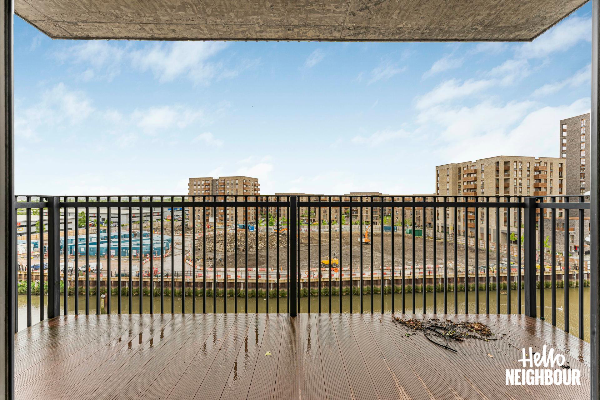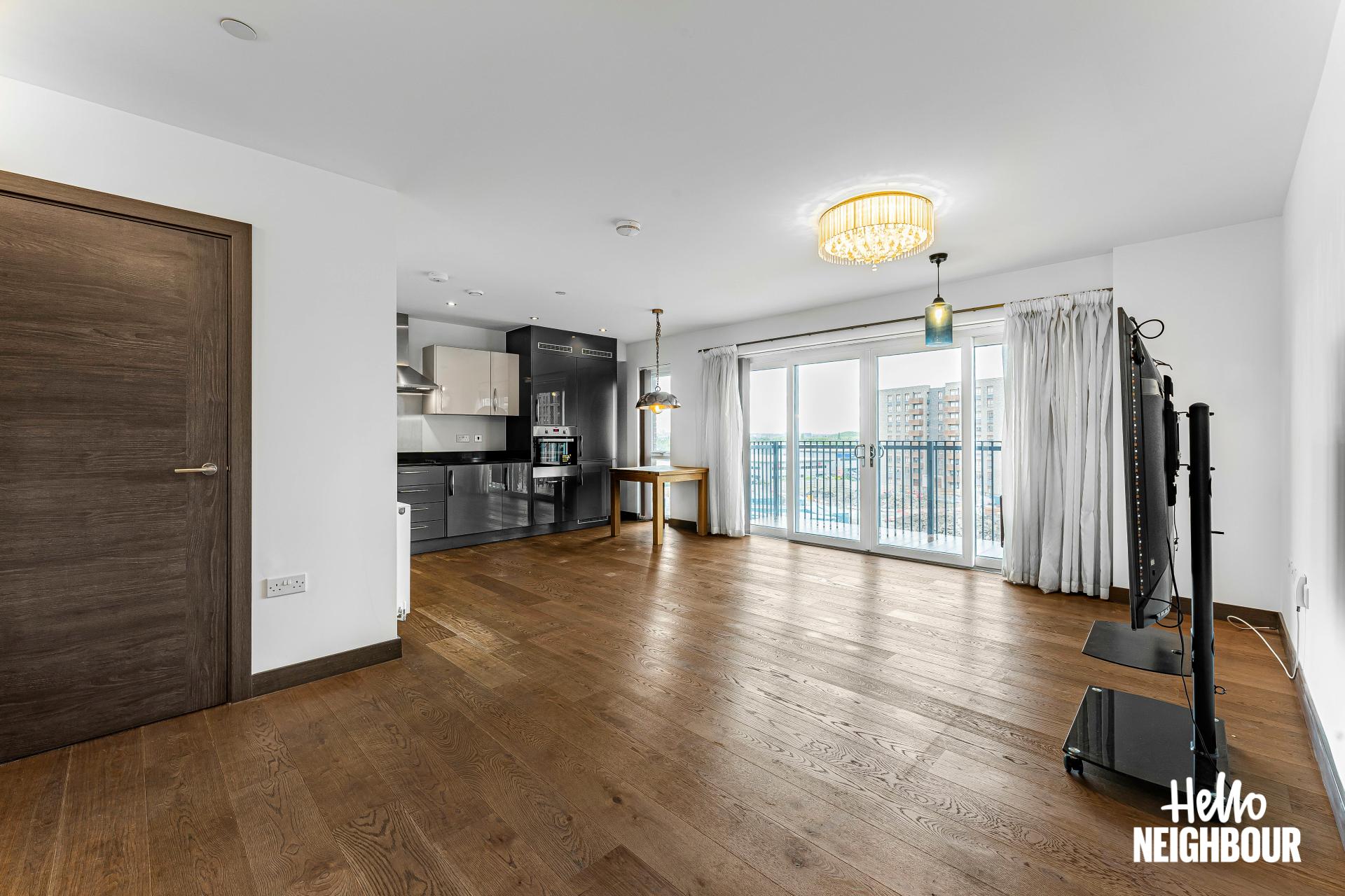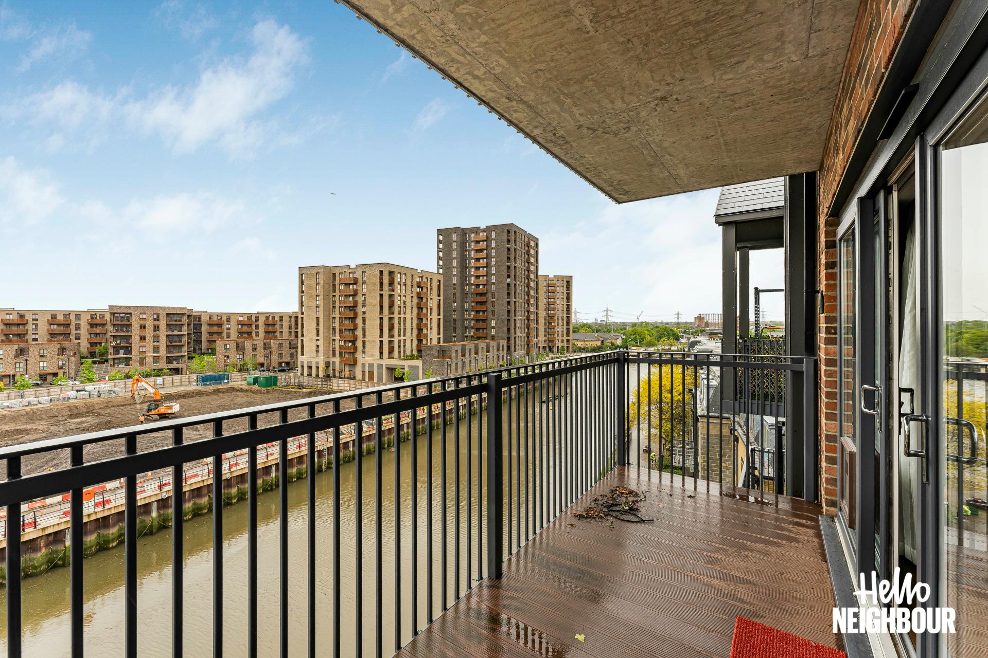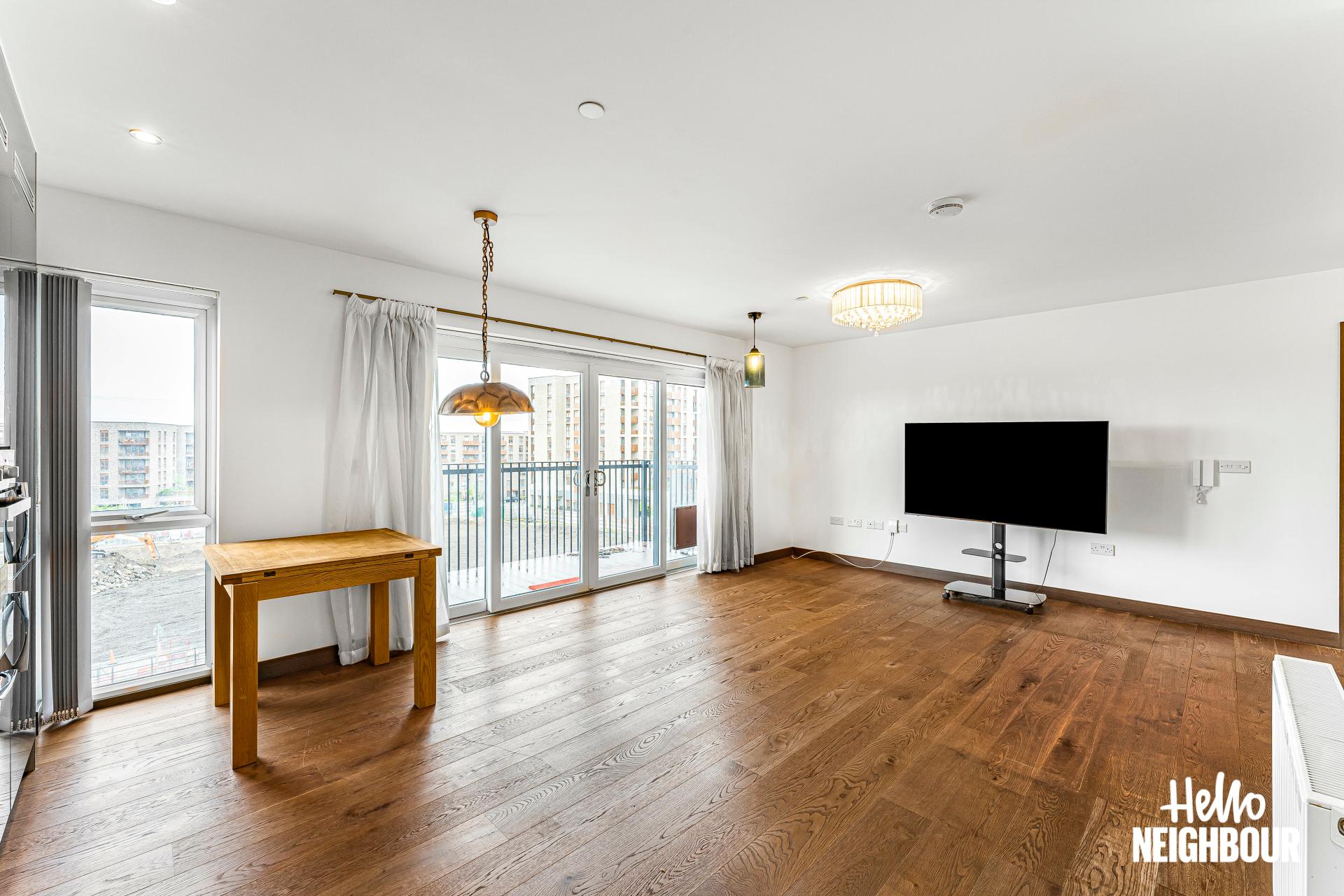 Hello Neighbour are proud to present this modern and spacious 2-bedroom flat part furnished, located in Barking, IG11.\n\nBoasting a spacious layout and high-spec finishes throughout, this property this property is ideal for a professional single applicant, couples or small family. The flat is spacious, and light filled, thanks to large windows that flood the space with natural light, creating a warm and inviting atmosphere.\n\nUpon entering, you are greeted by an airy reception room bathed in natural light, leading seamlessly to a large balcony. The open-plan design effortlessly connects the reception room to a fitted modern kitchen, complete with integrated appliances. The two double bedrooms feature storage options plus one of them has a private balcony, and the two 3-piece bathrooms offer convenience and comfort for residents and guests alike.\n\nSituated within walking distance to the picturesque green spaces of Barking Abbey Grounds, residents can enjoy leisurely strolls and outdoor activities amidst tranquil surroundings. Furthermore, Barking rail station is just a 12-minute walk away, providing easy access to central London and beyond.\n\n*To book a viewing: submit your enquiry and you'll receive an email and SMS detailing availability - within 10 min
