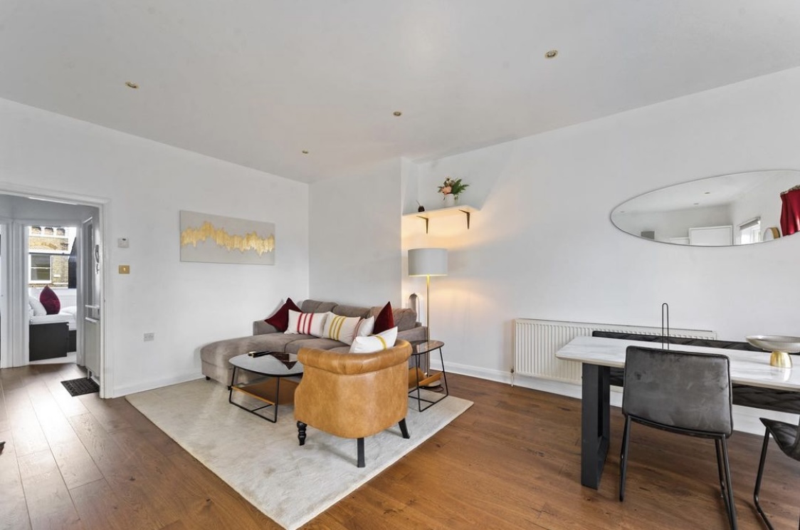 Hello Neighbour proudly presents this stunning first-floor 2-bedroom flat finished to an exceptional standard in a prime Wandsworth location, SW18.\n\nThis furnished residence features an expansive reception room that seamlessly flows into a dining area, creating a welcoming space for relaxation and entertaining. The sleek, modern fitted kitchen is semi-open plan, complete with a stylish kitchen bar, perfect for casual dining.\n\nThe two well-proportioned double bedrooms, one of which is a king sized master bedroom, both boast built-in cupboards and receive plenty of natural light. The flat also includes a larger-than-average modern 3-piece bathroom, exquisitely finished with stunning gold fixtures that add a touch of luxury. \n\nTransport:\nGeraldine Road is ideally positioned, with Wandsworth Town mainline station approximately 0.4 miles away, providing regular direct train services to Clapham Junction and London Waterloo. Numerous bus routes serve the area, making commuting convenient and straightforward.\n\nOld York Road, just 0.5 miles away, offers local restaurants, boutique shops, pubs, and bars. Southside Shopping Centre, 0.4 miles away, features high street shops, dining, a cinema, and supermarkets like Waitrose and Sainsbury’s.\n\nParking: on street permit with council.\nPets: on request.\n\n*To book a viewing: submit your enquiry and you'll receive an email and SMS detailing availability - within 10 min