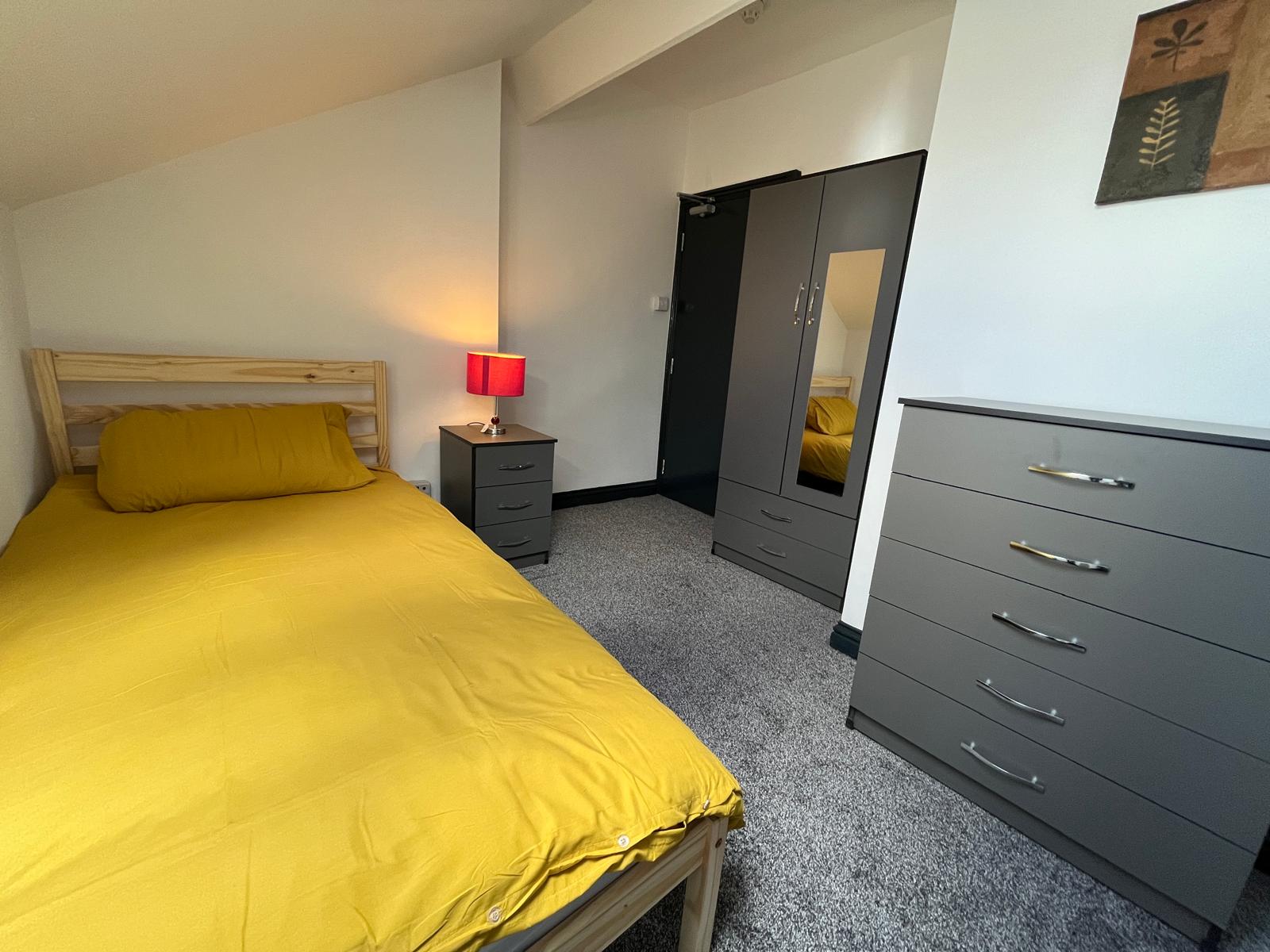 One single room to rent in a large, 4 bedroomed house located in Wakefield. The property is within walking distance to Sandal and Agbrigg train station. It is close to Wakefield city centre and a 7 minute drive to Pinderfields Hospital. Please see below for individual rates. \n\nSINGLE ROOM £475 PCM\n\nIncludes most bills except the bedrooms which the heaters are topped up via pre payment meters. Council tax is included in the rent. Street parking outside. Housing benefit accepted.\n\nDownstairs you will find the shared living room which includes 2x sofas, and a smart TV which includes Virgin TV. Virgin media broadband installed and included with the rent.\n\nDownstairs also is the kitchen with grey gloss kitchen units. Includes freestanding American fridge freezer. Built in oven and gas hob. Freestanding washing machine. Plenty of space to sit and eat with a large dining table and 4 chairs.\n\nThe bedrooms are located on the first and second floors. All bedrooms have en-suite shower rooms.\n\nAvailable room is a single room on the second floor. Consists of bed, wardrobe, drawers, bedside table and lamp and en suite shower room. Bedding not included. Electric heating which is topped up via pre payment meter. All other bills are included.  Current tenants are three males.