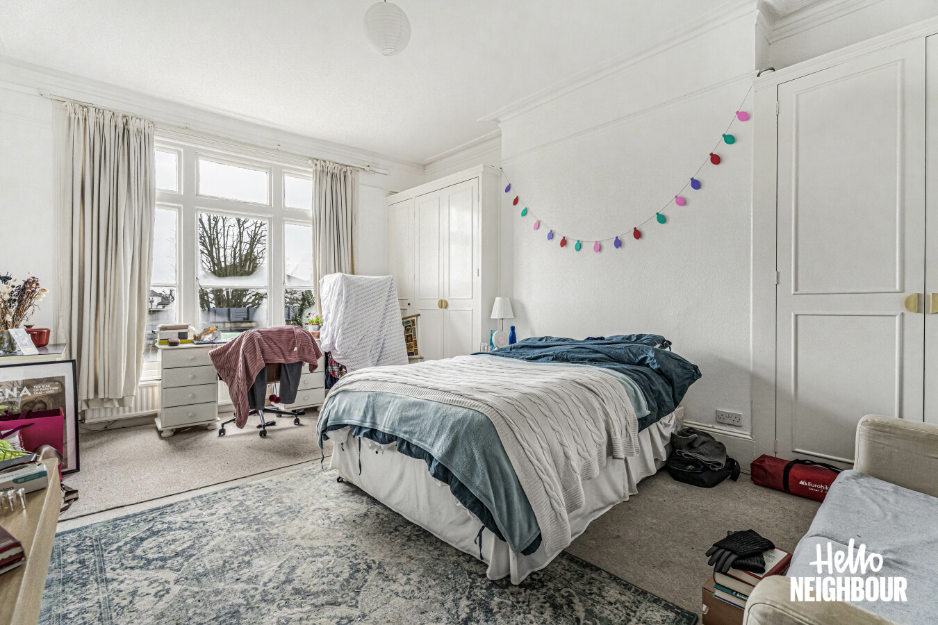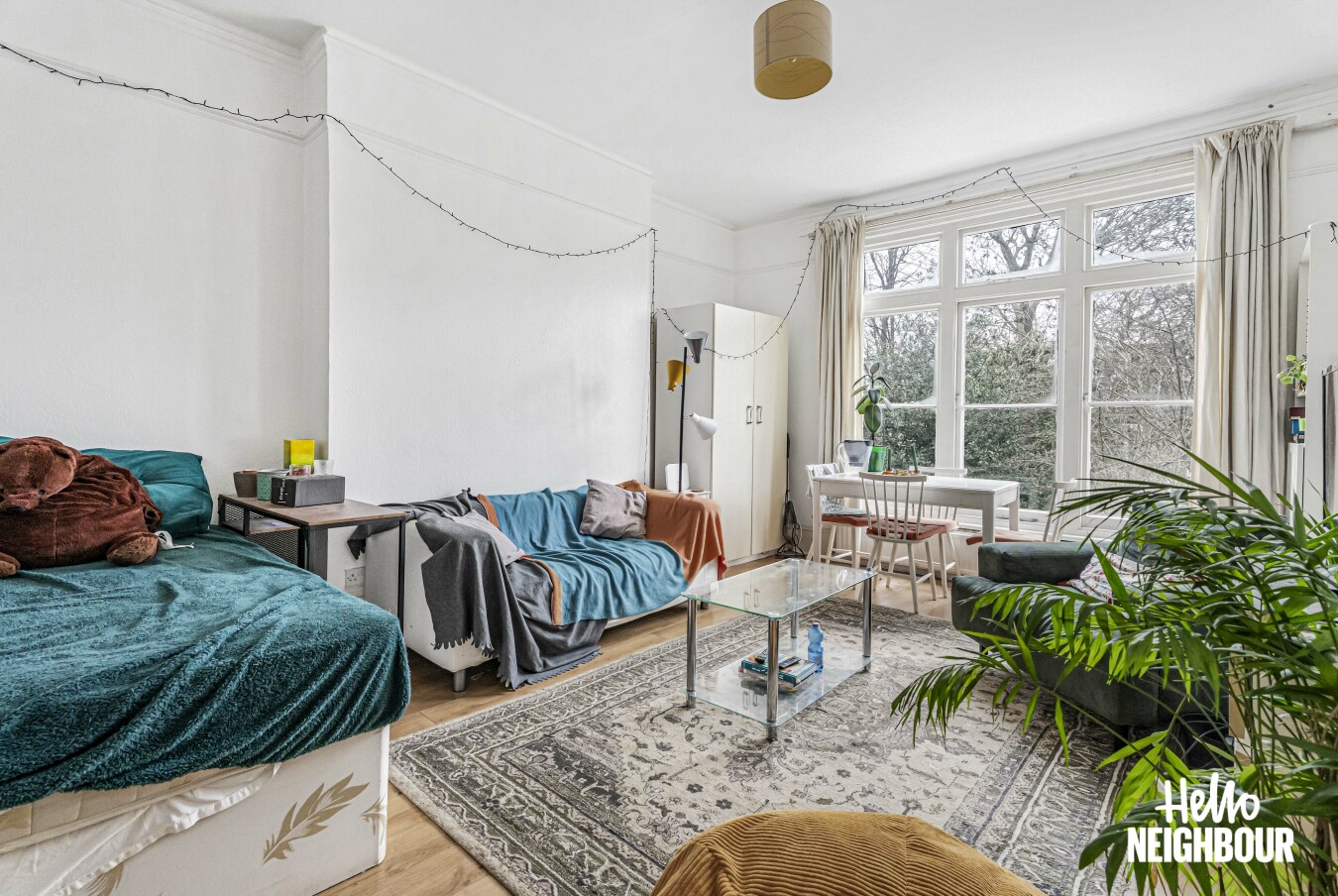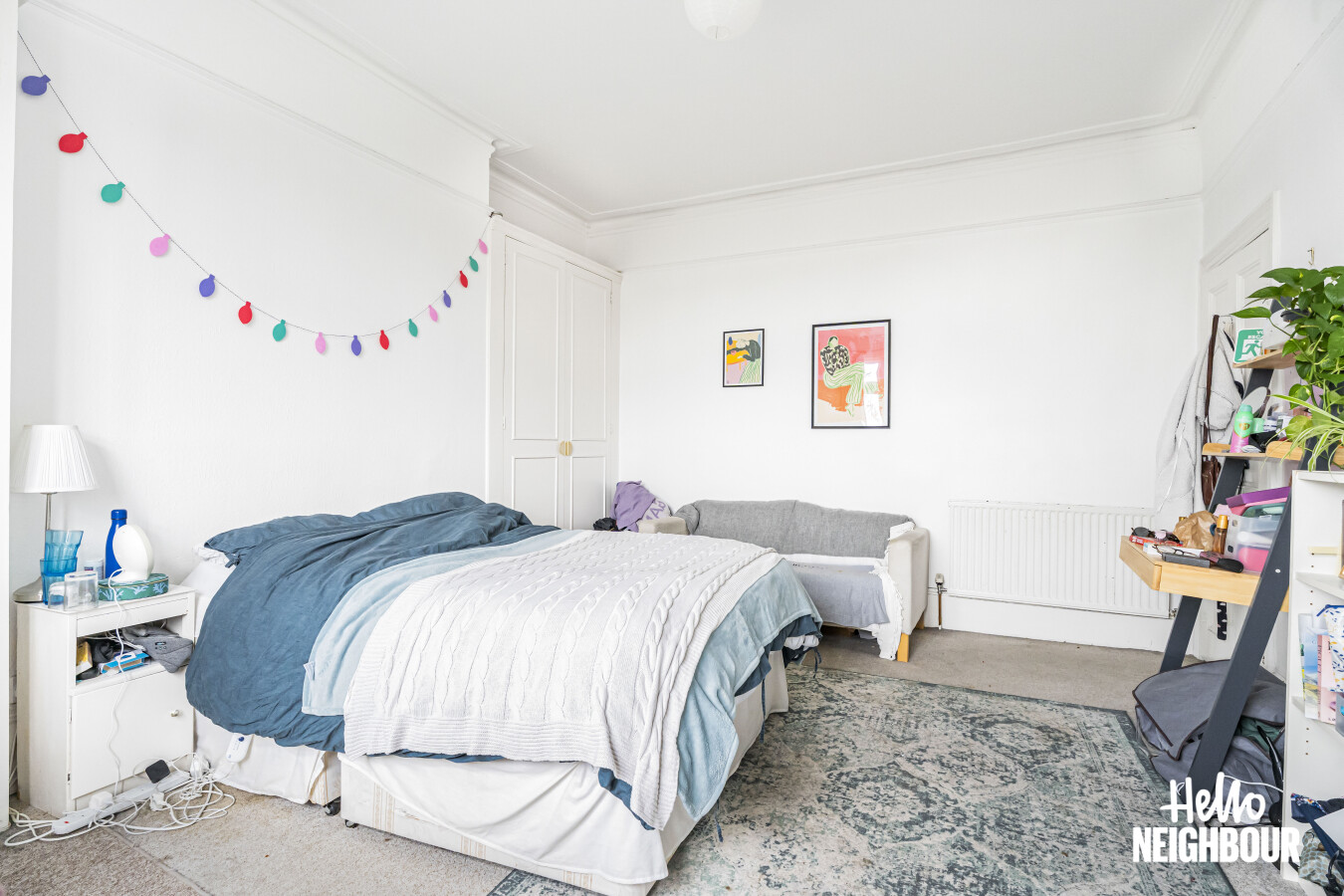 Hello Neighbour are pleased to present this well proportioned two bedroom apartment set within a characterful period building.\n\nThe property offers a bright reception room with high ceilings and large sash windows, creating an open and airy living space suitable for both relaxing and dining. The separate kitchen is fully fitted and includes a gas hob, oven, washing machine and ample worktop and cupboard space.\n\nBoth bedrooms are generously sized, with the principal bedroom benefitting from a bay window and excellent natural light. The bathroom is fitted with a full suite including a bath and overhead shower and benefits from a window for ventilation.\n\nOffered fully furnished with white goods included, this apartment is well suited to professional tenants seeking a spacious and characterful home. Permit parking is available on street.\n\nPets: Sadly not permitted\nParking: Permit parking\nSharers: Max 2 professionals or professional couple\n\nTo book a viewing, submit your enquiry and you will receive an email and SMS detailing availability within 10 minutes.