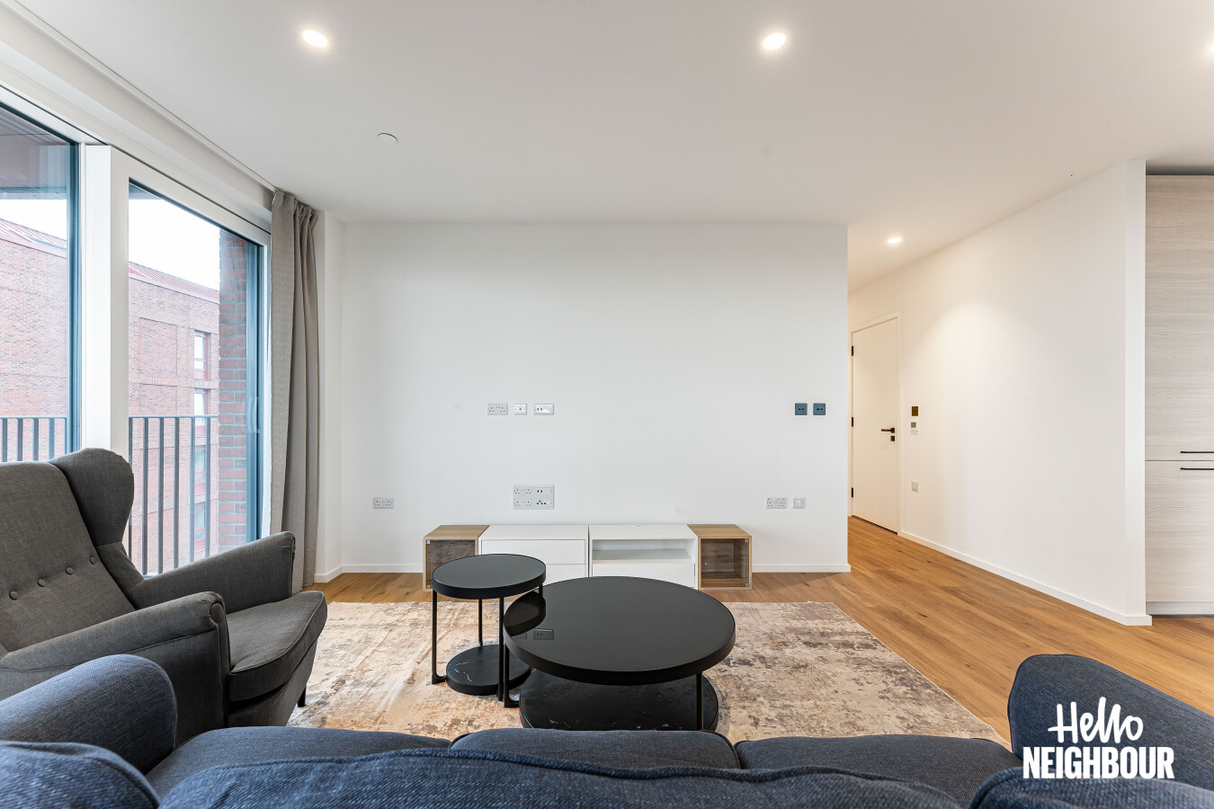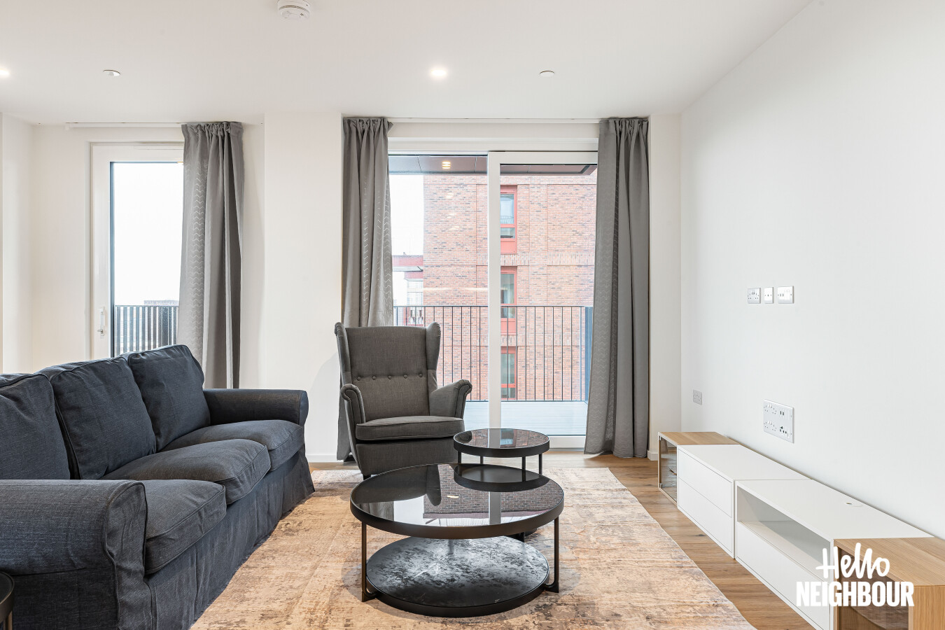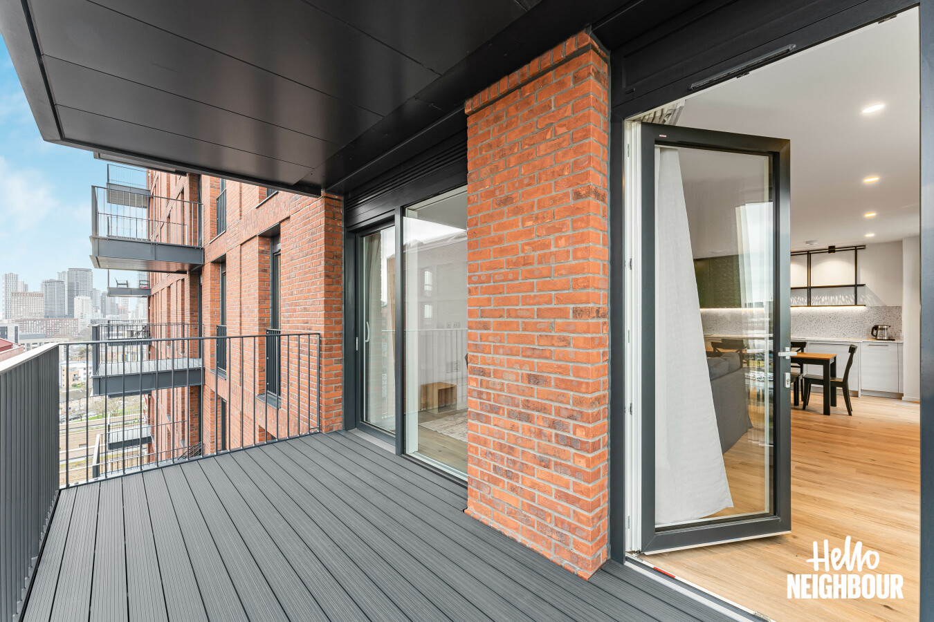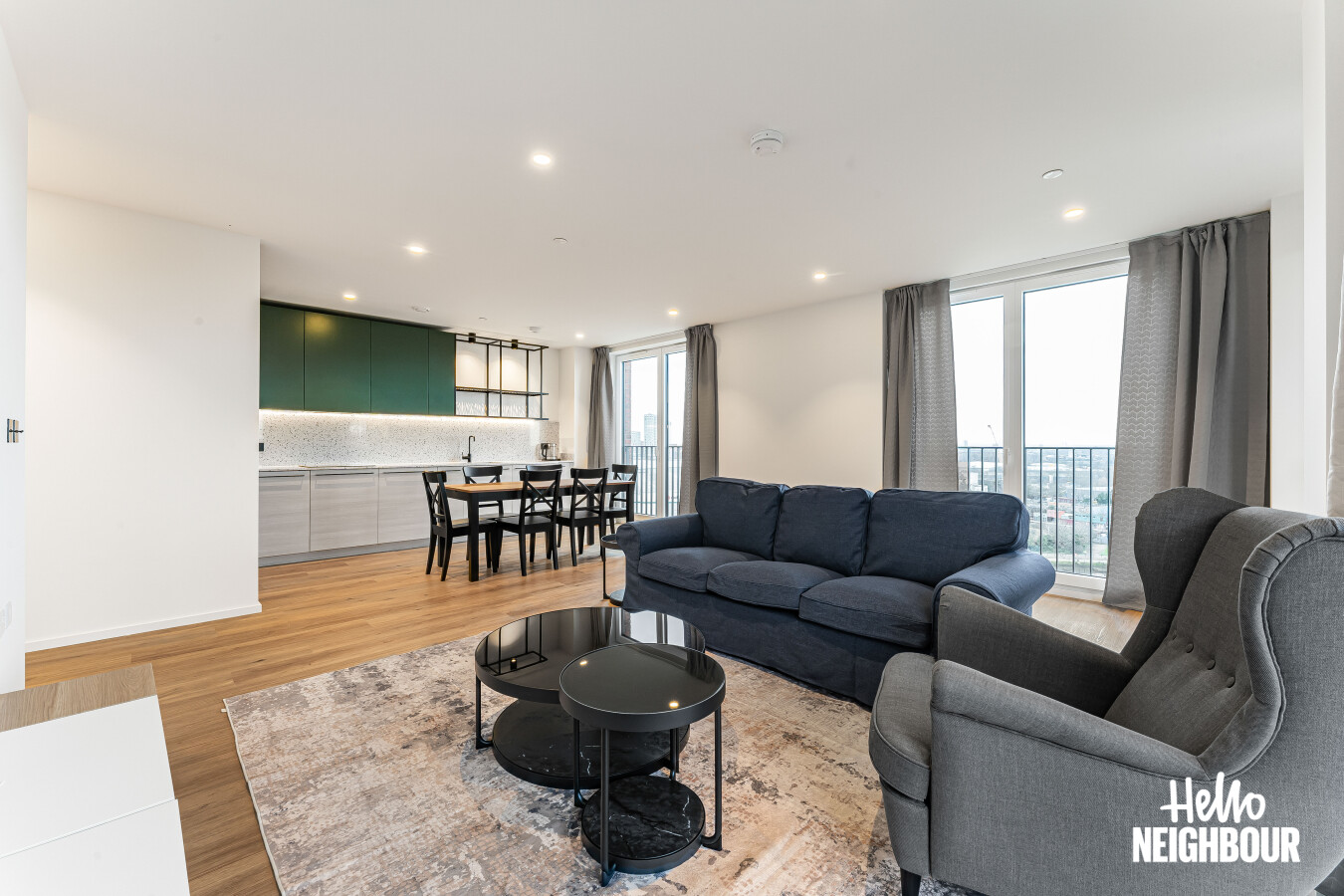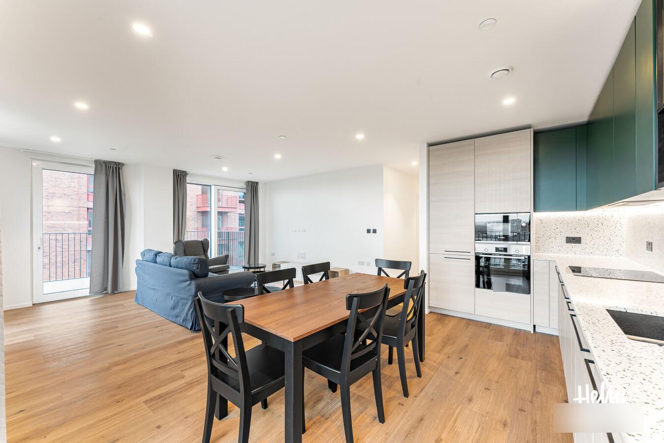 Hello Neighbour are delighted to present this brand new, fully furnished 2-bedroom, 2-bathroom apartment with a large private balcony, located within the highly sought-after Aberfeldy Village development, E14.\n\nSituated on an upper floor, the property offers a bright and spacious open-plan kitchen and reception area, finished to a high contemporary standard. Floor-to-ceiling windows allow excellent natural light throughout and provide access to a generous private balcony boasting impressive far-reaching views, ideal for relaxing or entertaining.\n\nThe modern integrated kitchen features sleek cabinetry, stone worktops, and built-in appliances, complemented by a dedicated dining area and stylish furnishings throughout the living space.\n\nBoth bedrooms are well-proportioned doubles, with the main bedroom benefiting from built-in wardrobes and a contemporary en-suite shower room. A second modern bathroom serves the remainder of the apartment, finished with high-quality tiling and fittings.\n\nOffered fully furnished with upmarket furniture, the apartment is ready to move into and perfectly suited to professionals seeking modern riverside living. Residents also benefit from a concierge service and well-maintained communal surroundings within this popular new development.\n\nLocated in Aberfeldy Village, the property enjoys easy access to local amenities, riverside walks, and excellent transport links into Canary Wharf and Central London.\n\nPets: Sadly not permitted\nParking: Not available