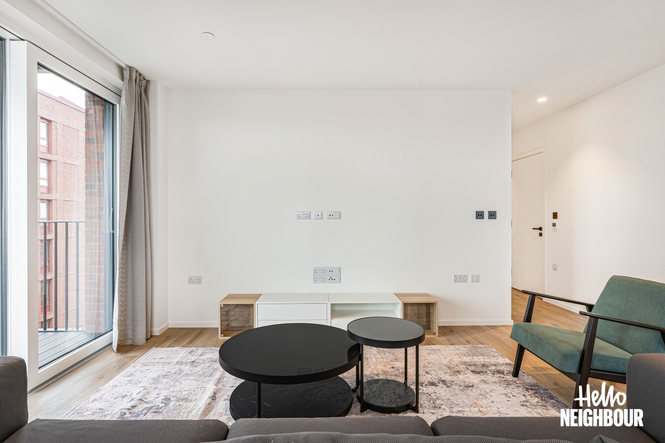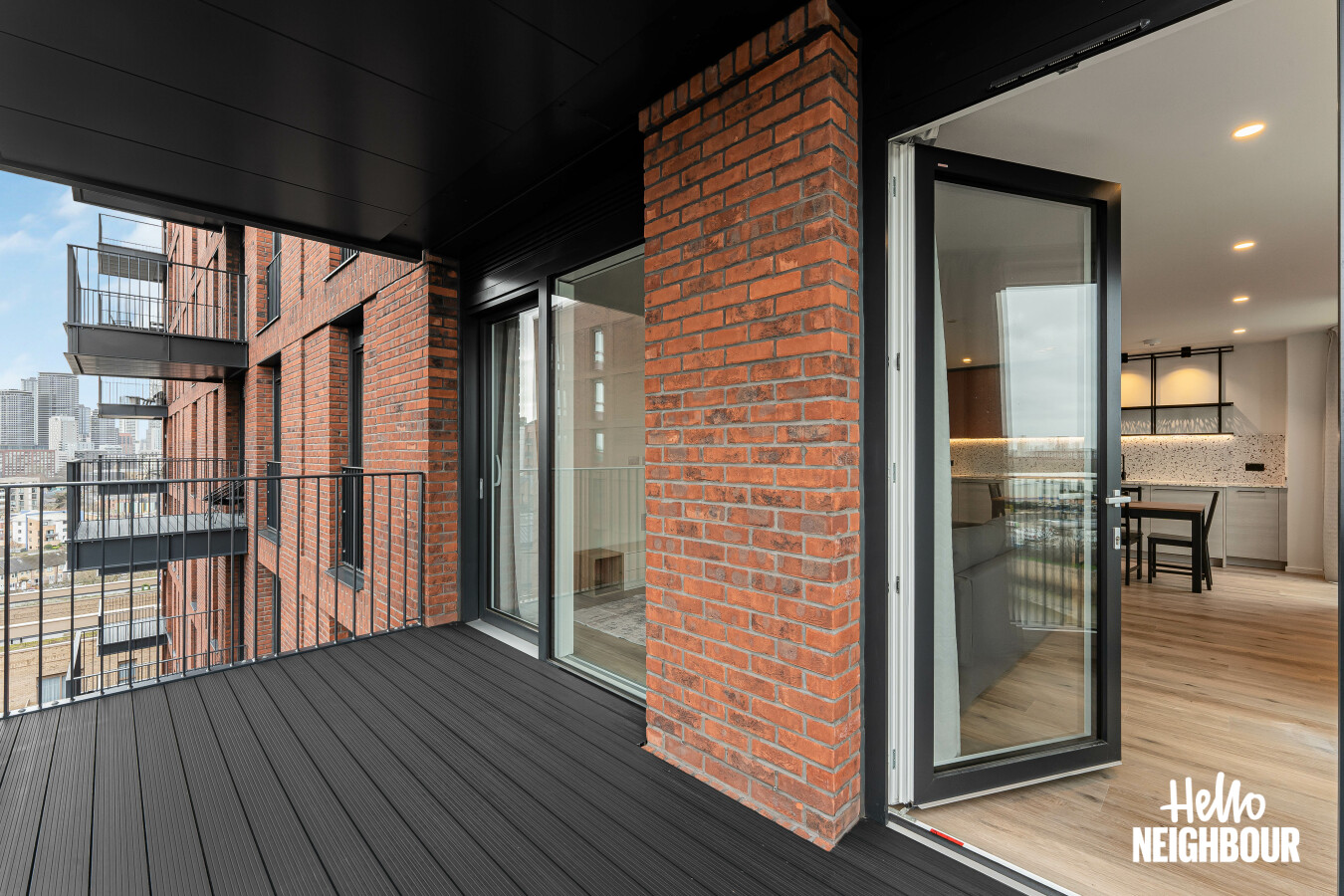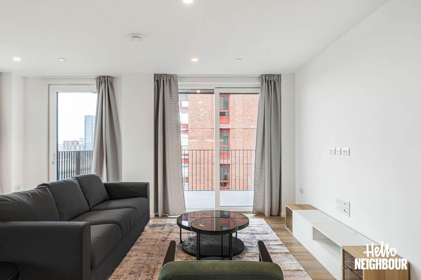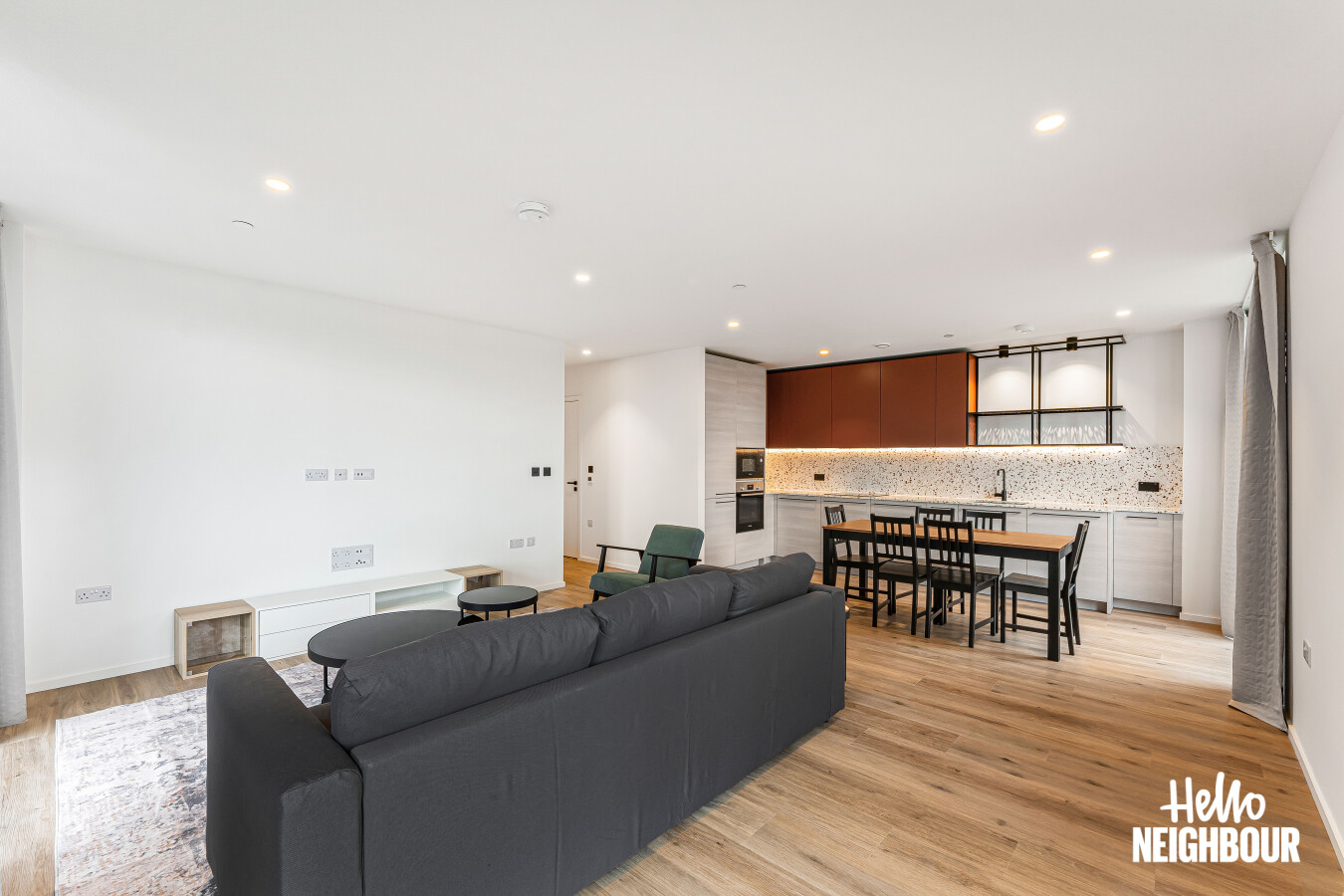 Hello Neighbour are delighted to present this brand new, fully furnished 2-bedroom, 2-bathroom apartment with a large private balcony, located within the highly sought-after Aberfeldy Village development, E14.\n\nSituated on an upper floor, the property offers a bright and spacious open-plan kitchen and reception area, finished to a high contemporary standard. Floor-to-ceiling windows allow excellent natural light throughout and provide access to a generous private balcony boasting impressive far-reaching views, ideal for relaxing or entertaining.\n\nThe modern integrated kitchen features sleek cabinetry, stone worktops, and built-in appliances, complemented by a dedicated dining area and stylish furnishings throughout the living space.\n\nBoth bedrooms are well-proportioned doubles, with the main bedroom benefiting from built-in wardrobes and a contemporary en-suite shower room. A second modern bathroom serves the remainder of the apartment, finished with high-quality tiling and fittings.\n\nOffered fully furnished with upmarket furniture, the apartment is ready to move into and perfectly suited to professionals seeking modern riverside living. Residents also benefit from a concierge service and well-maintained communal surroundings within this popular new development.\n\nLocated in Aberfeldy Village, the property enjoys easy access to local amenities, riverside walks, and excellent transport links into Canary Wharf and Central London.\n\nPets: Sadly not permitted\nParking: Not available