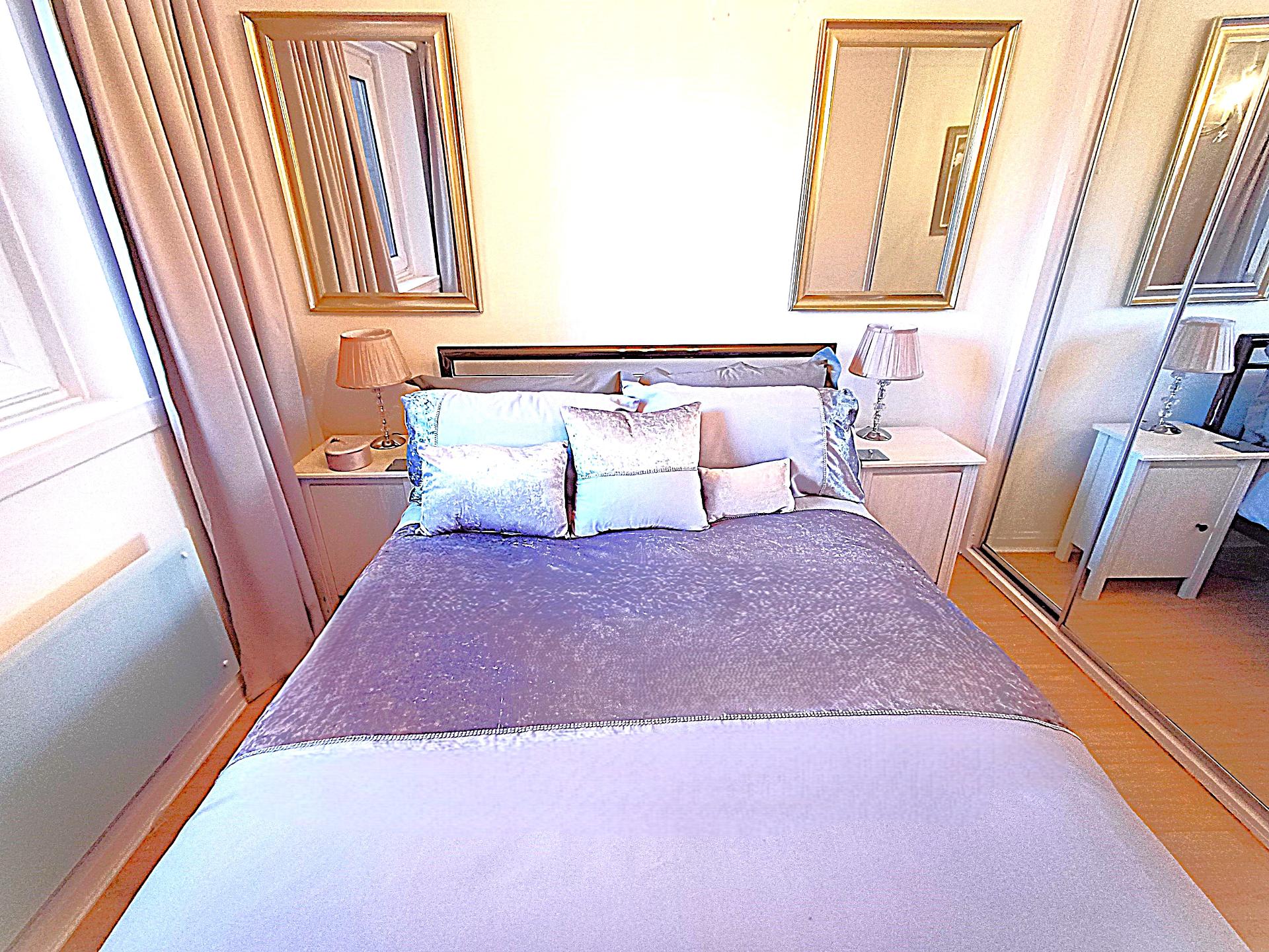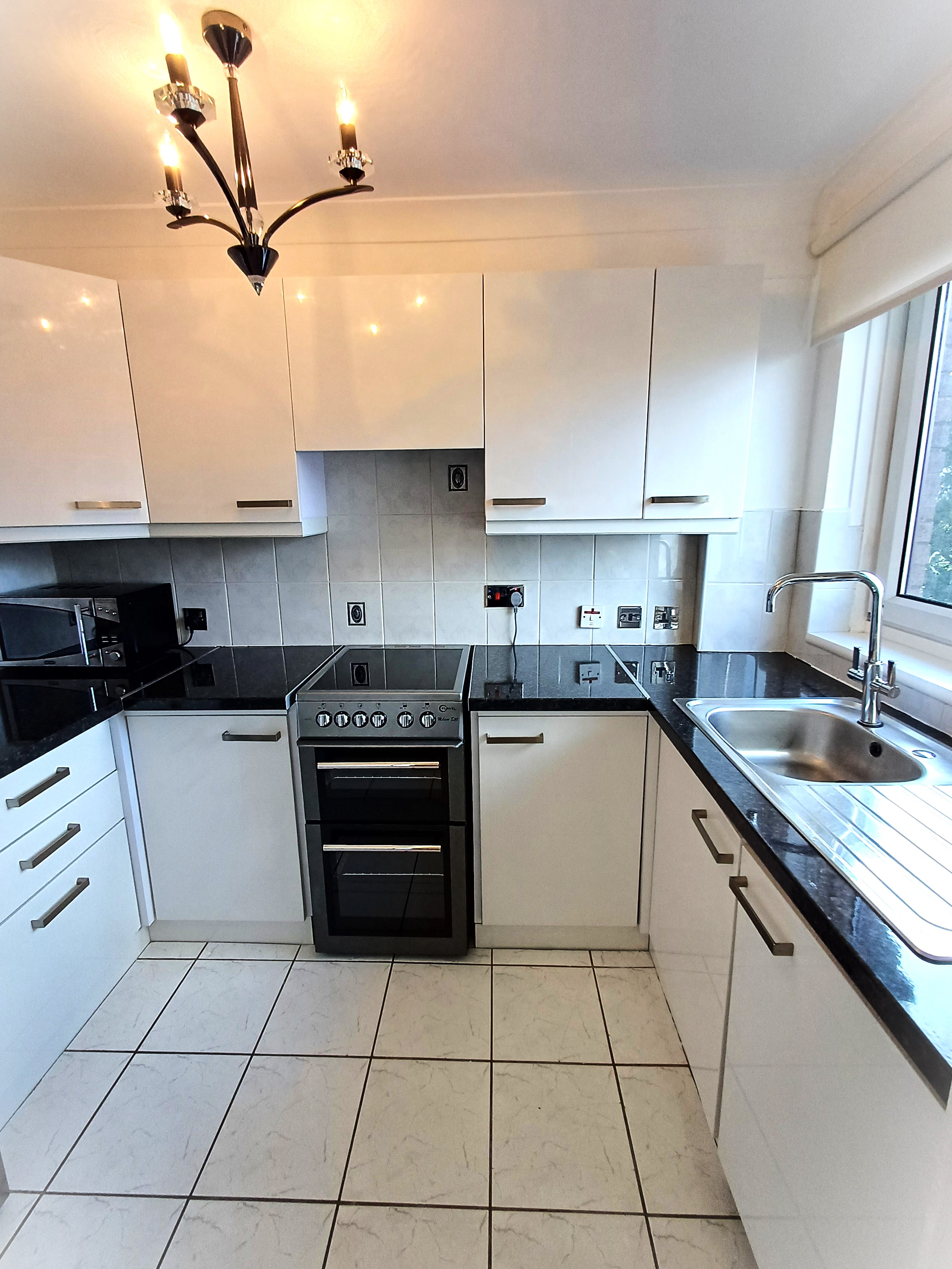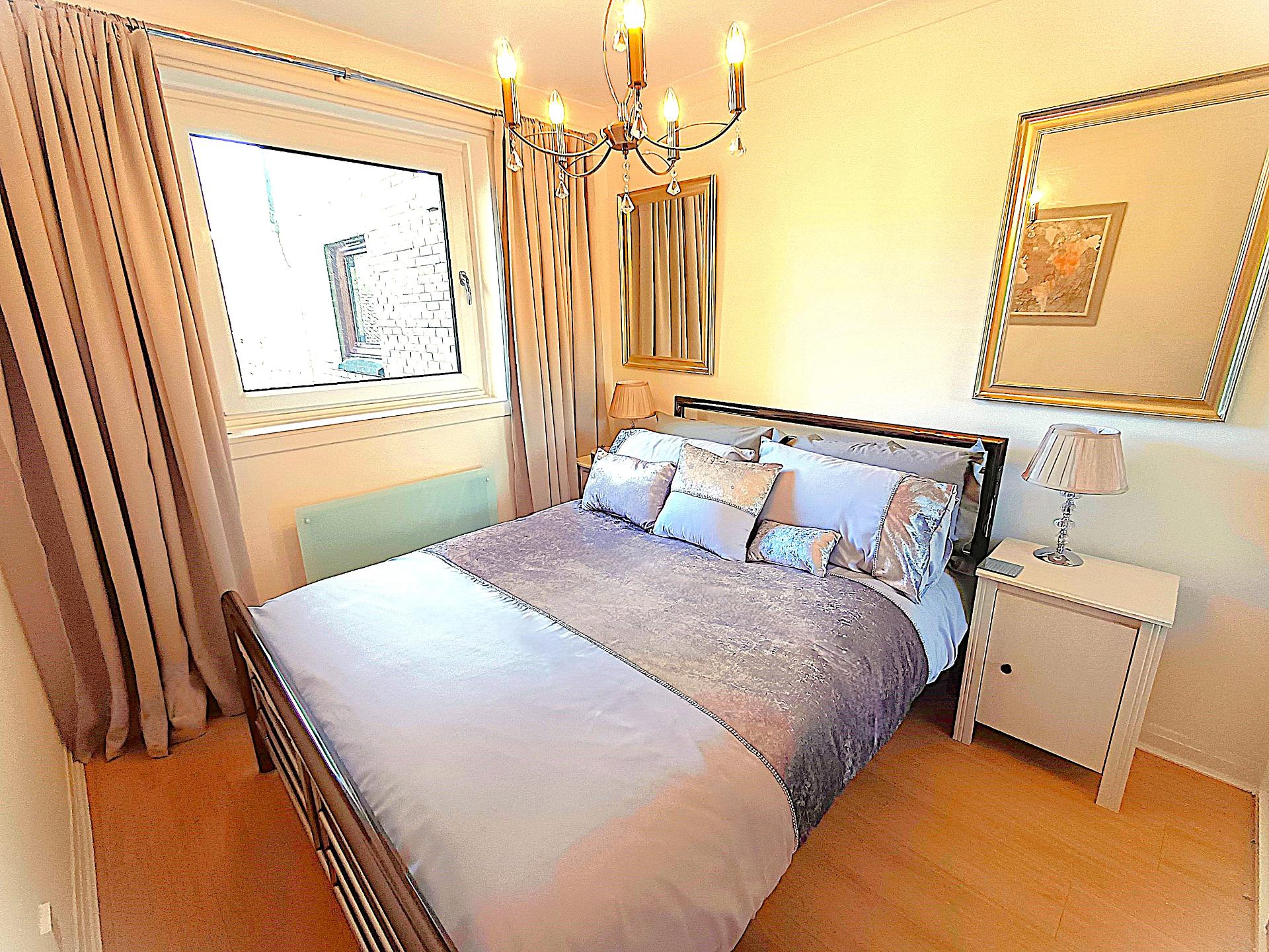 The second bedroom is set up as an office or guest room with folding desk and sofa bed.\n\nGENUINELY FULLY FURNISHED:\nThe property includes all furniture, curtains, blinds, kitchen implements, plates, bowls, cups, glasses, pots, pans, iron, ironing board, clothes airers, towels, spare towels, bedding, spare bedding, hangers in the wardrobes etc. Therefore, you don't need to worry about spending extensive time and money sourcing all of these things. You can walk in and sit down!\n\nA luxurious second floor apartment in true walk-in condition.\nThis apartment comprises a living room, kitchen, reception hallway, two double bedrooms and family bathroom with walk-in shower.\n\nMore than ample hidden storage spaces.\n\nDecorated to show home standard. This apartment has been painted in a pleasing white tone which compliments the new laminate flooring and stylish tiles in the kitchen and bathroom. The decor is exemplary.\n\nLarge picture double glazed windows flood the apartment with light which is further accentuated by stunning chandeliers in every room.\n\n• Deposit: £1350\n• Fully Furnished in walk-in condition\n• Electric heating\n• Double Glazing\n• DISHWASHER\n• Free Parking\n• Landscaped grounds\n• Very quiet area\n• Nearby access to the M73, M74 and M8.\n• Audio Security Entry\n• Council Tax C\n• EPC C\n• Second floor apartment\n• Bills not included\n• Family friendly\n• Credit checks, references and ID checks required for all adult tenants\n• No Subletting\n• LL Reg: 523015/380/07052\n1797271/380/10022