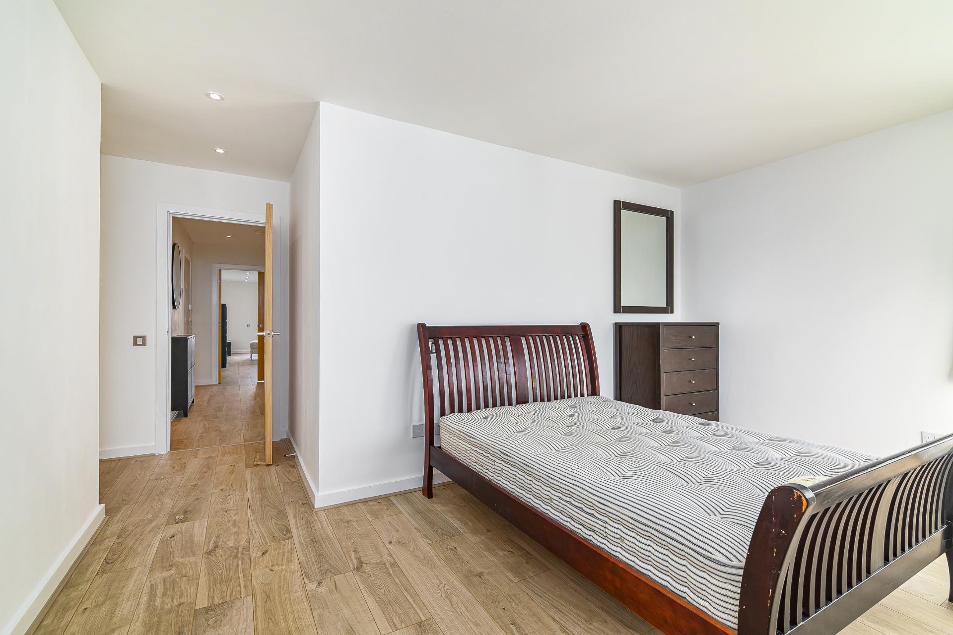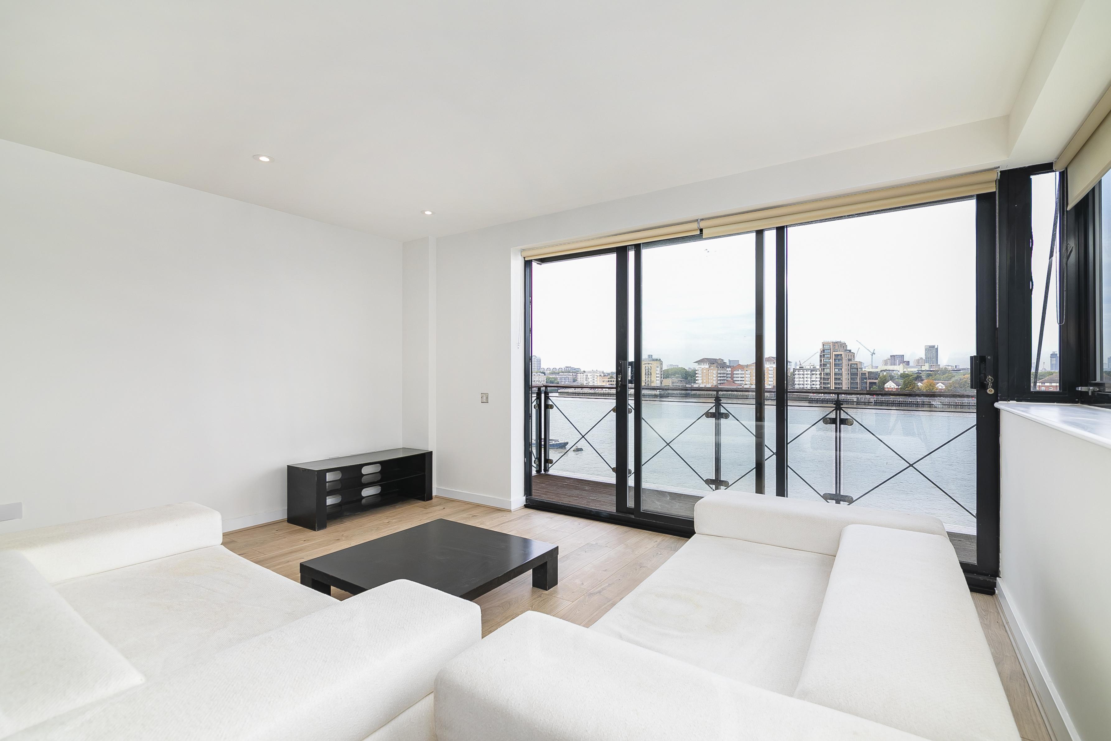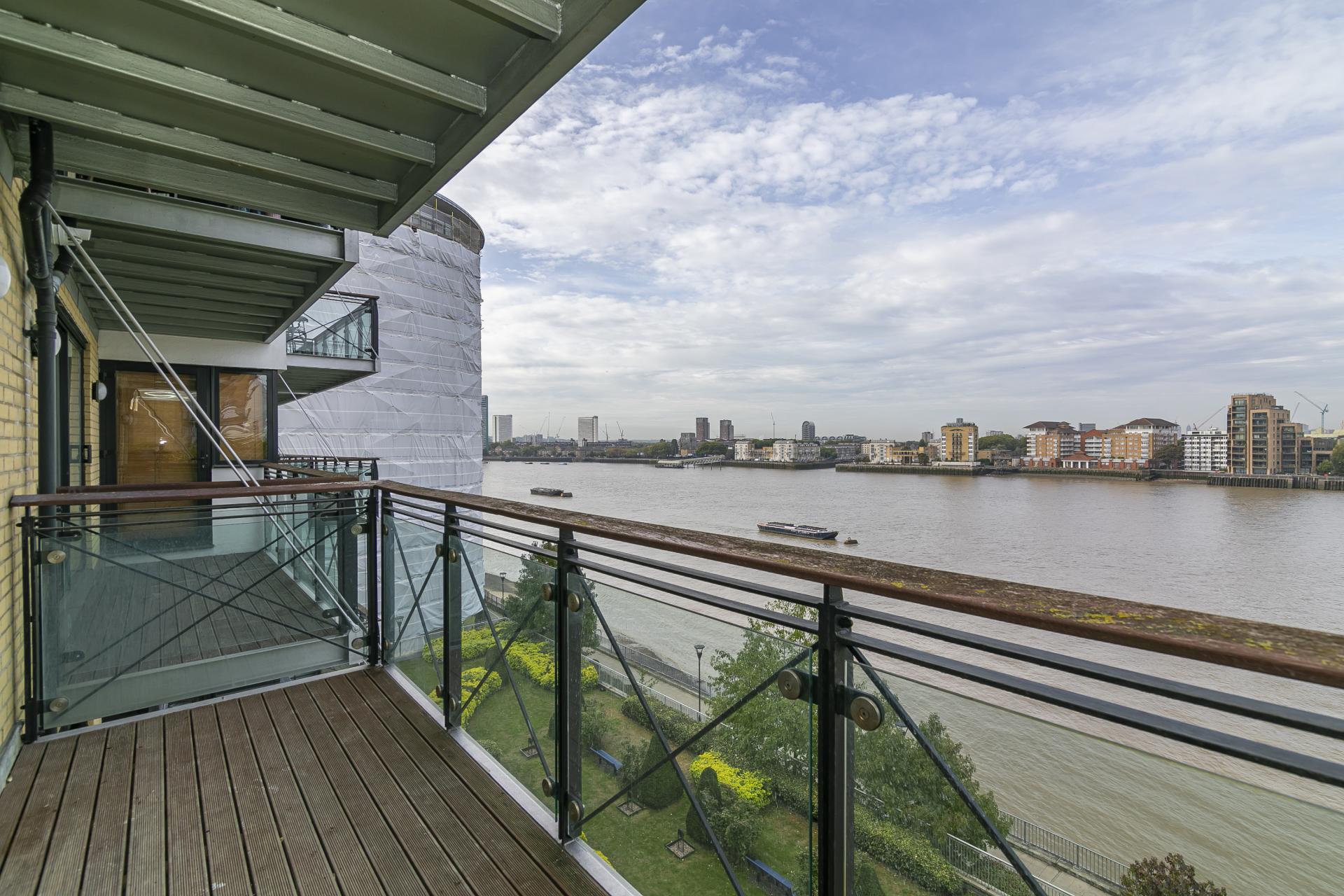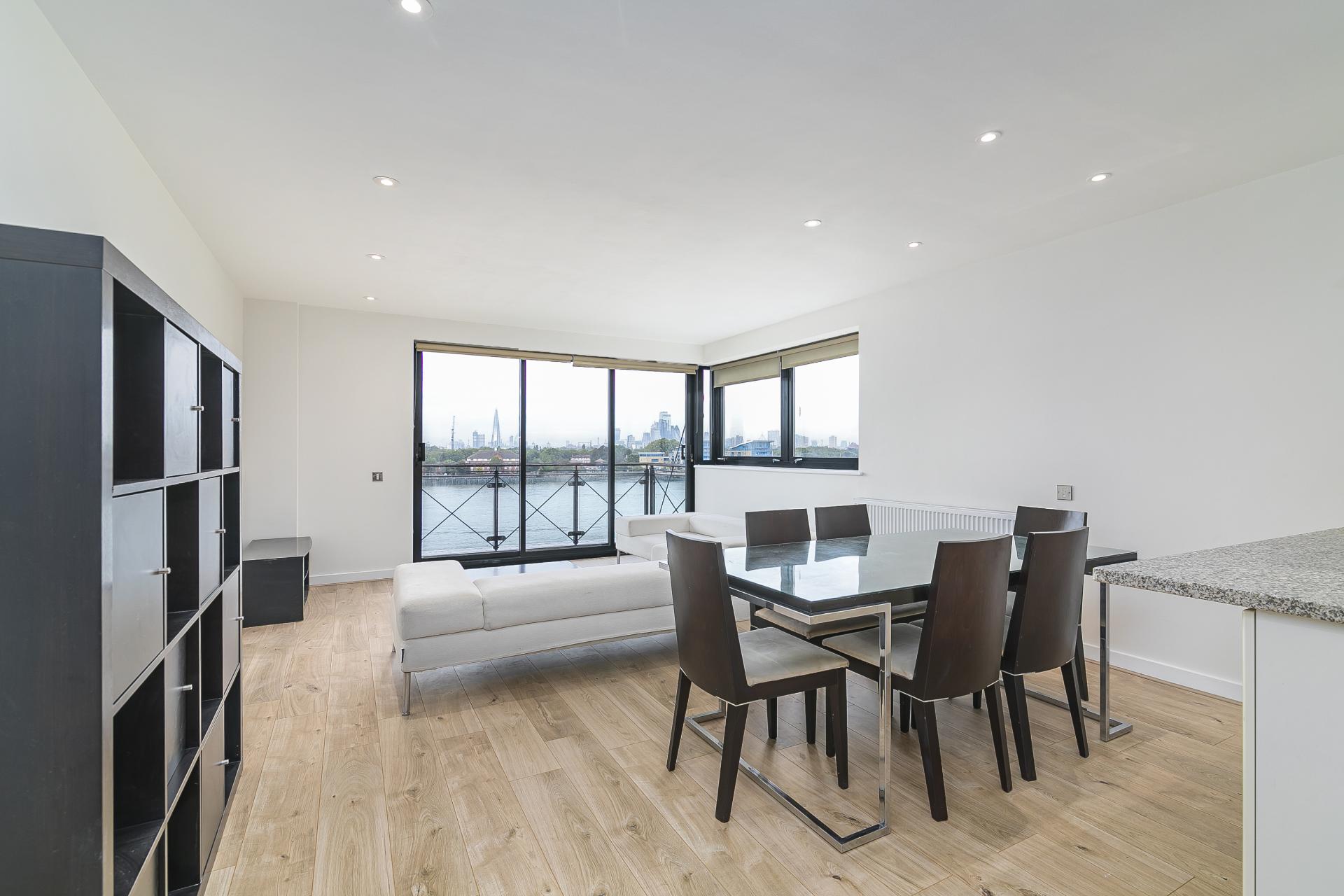 This large contemporary fifth floor two bedroom apartment is set within a sought-after riverside development close to Canary Wharf and boasts luxury interiors with spectacular river views from a private balcony.\n\nKey features\n\n- Newly refurbished, new flooring throughout, new en-suite bathroom, new gas central heating system, new LED downlights in all rooms, hyperoptic broadband, freshly decorated throughout. \n\n- Within sought-after riverside development with day concierge.\n\n- Water bills included\n\n- Hyperoptic broadband\n\n- Larger than average two bedroom apartment set on the fifth floor with direct panoramic river views over London.\n\n- Private covered secure parking space included.\n\n- Smart open-plan kitchen with fitted appliances.\n\n- Bright reception room with space to dine.\n\n- Master bedroom with fitted wardrobes and en-suite bathroom.\n\n- Good sized second bedroom with fitted storage.\n\n- Second family bathroom.\n\n-Private balcony boasting far reaching river views towards Shard\n\n- Located just 10 minutes walk from Canary Wharf tube station, Heron Quays DLR & Crossrail and all the fabulous amenities located within the Canary Wharf estate.