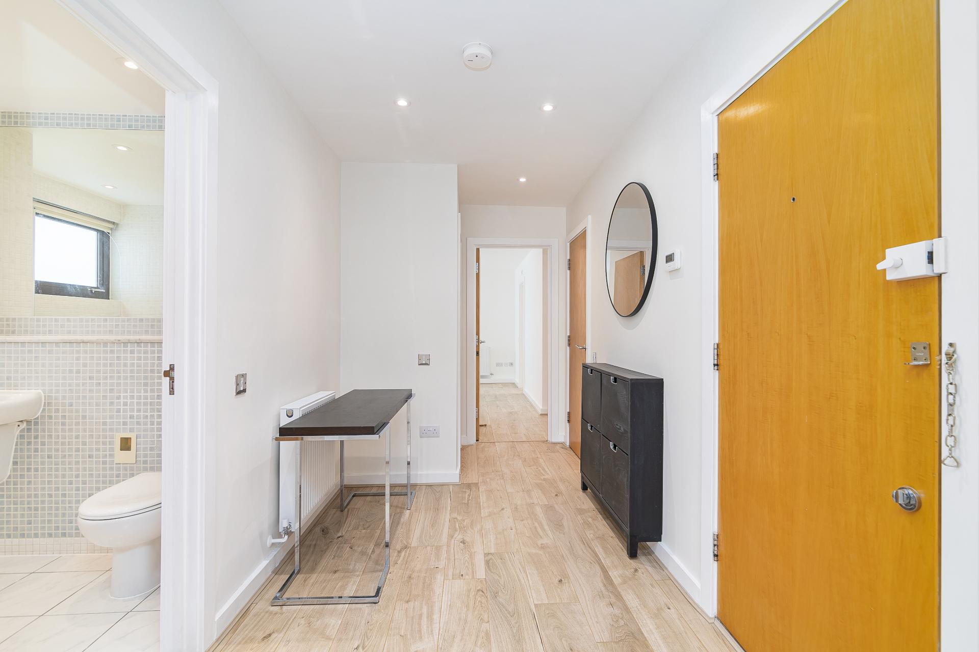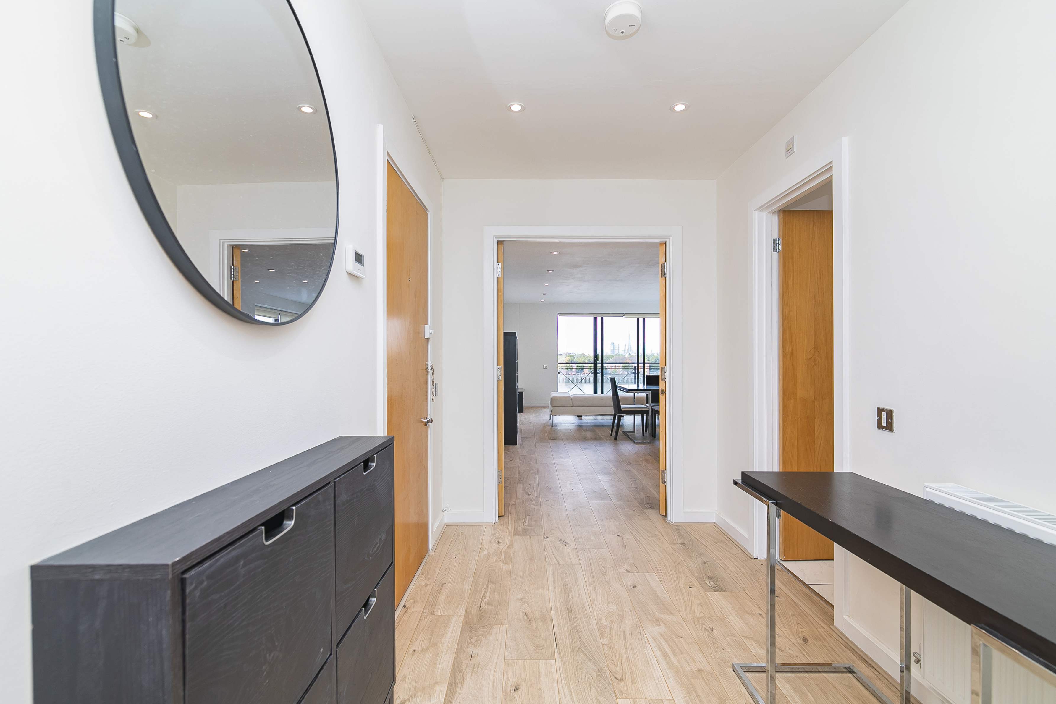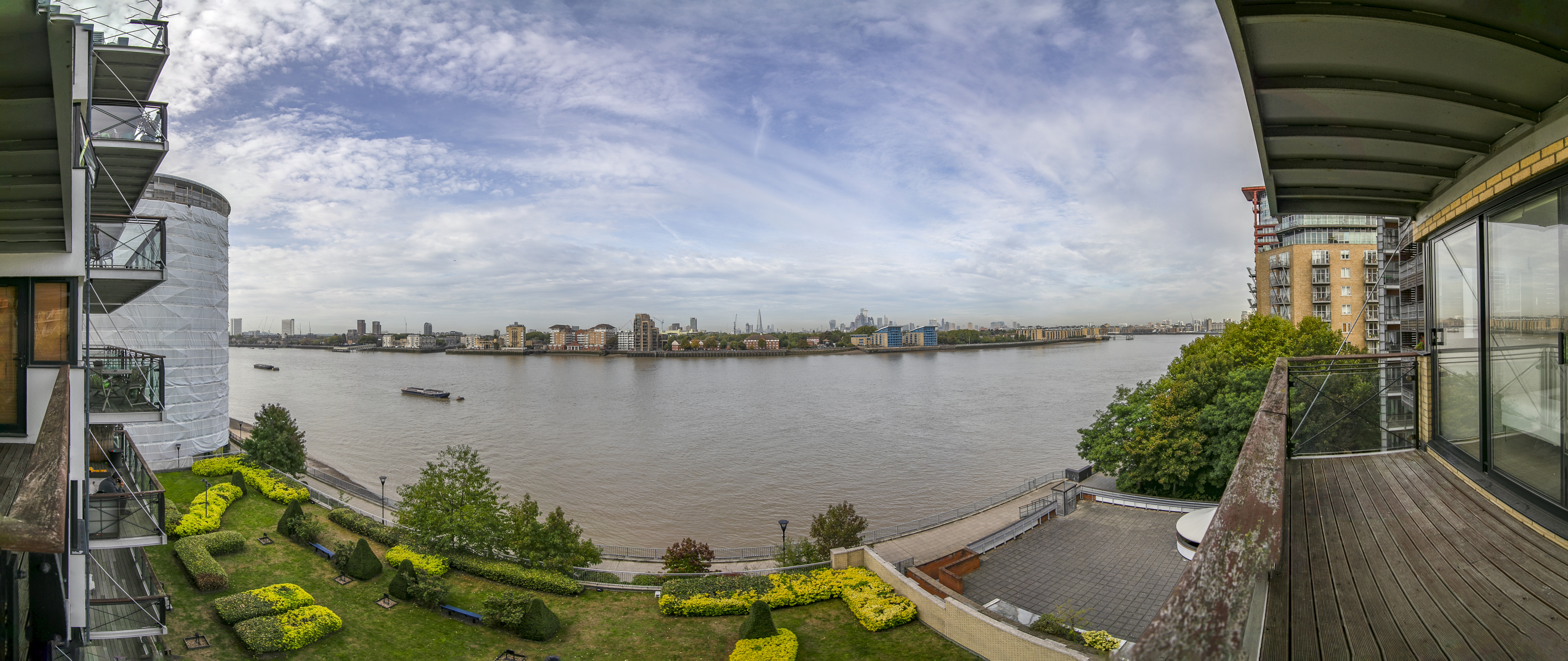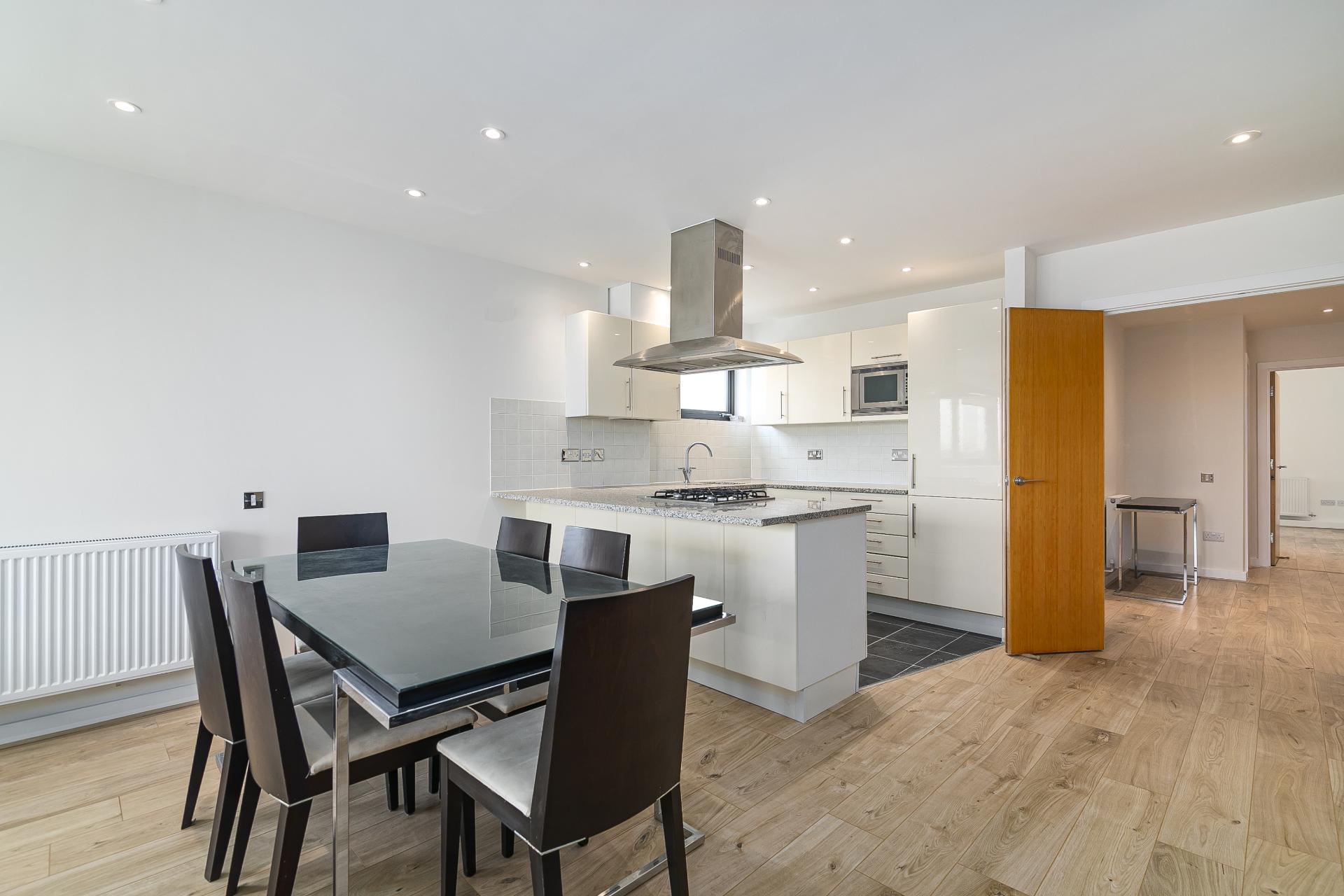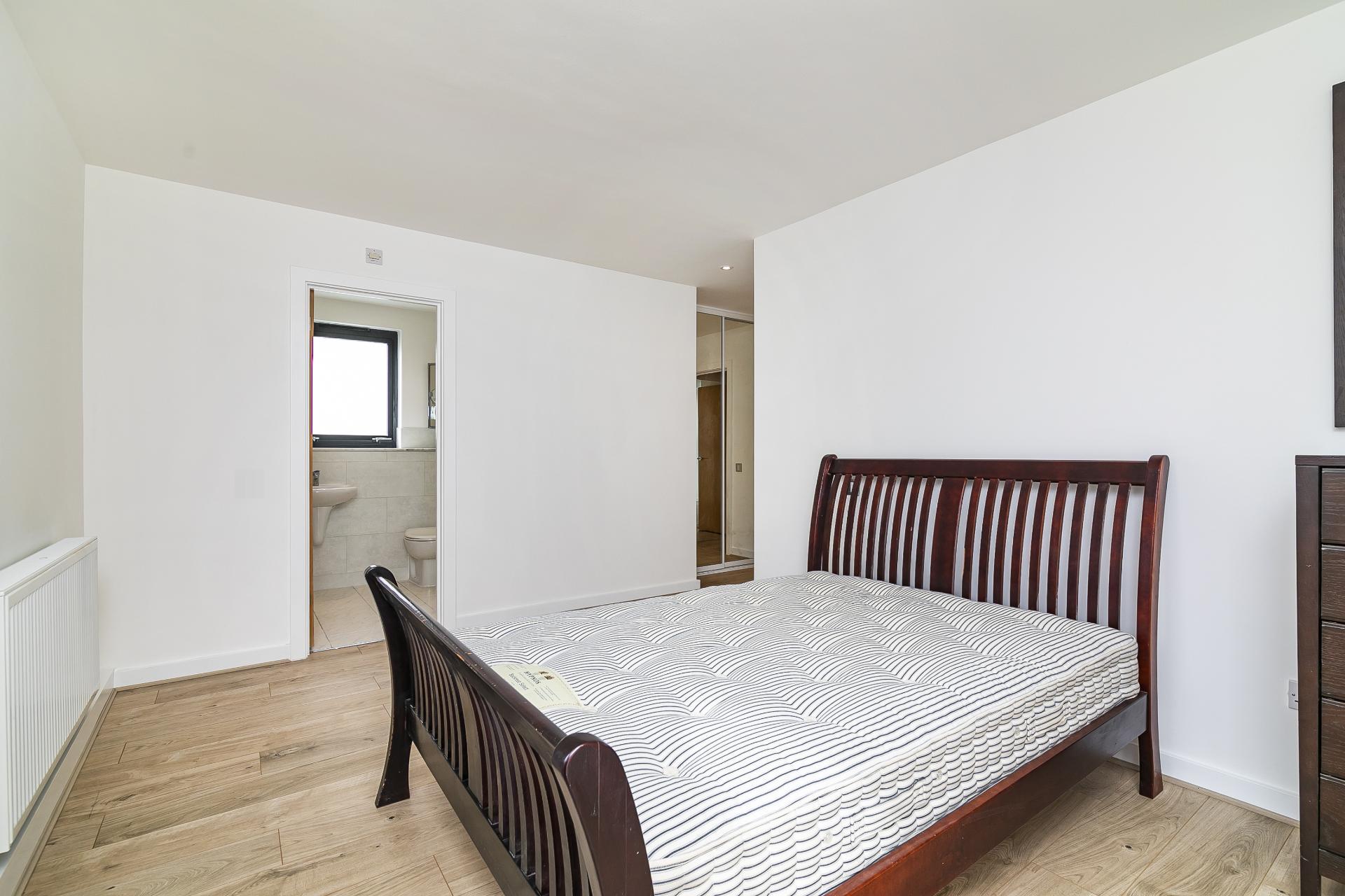 This large contemporary fifth floor two bedroom apartment is set within a sought-after riverside development close to Canary Wharf and boasts luxury interiors with spectacular river views from a private balcony.\n\nKey features\n\n- Newly refurbished, new flooring throughout, new en-suite bathroom, new gas central heating system, new LED downlights in all rooms, hyperoptic broadband, freshly decorated throughout. \n\n- Within sought-after riverside development with day concierge.\n\n- Water bills included\n\n- Hyperoptic broadband\n\n- Larger than average two bedroom apartment set on the fifth floor with direct panoramic river views over London.\n\n- Private covered secure parking space included.\n\n- Smart open-plan kitchen with fitted appliances.\n\n- Bright reception room with space to dine.\n\n- Master bedroom with fitted wardrobes and en-suite bathroom.\n\n- Good sized second bedroom with fitted storage.\n\n- Second family bathroom.\n\n-Private balcony boasting far reaching river views towards Shard\n\n- Located just 10 minutes walk from Canary Wharf tube station, Heron Quays DLR & Crossrail and all the fabulous amenities located within the Canary Wharf estate.