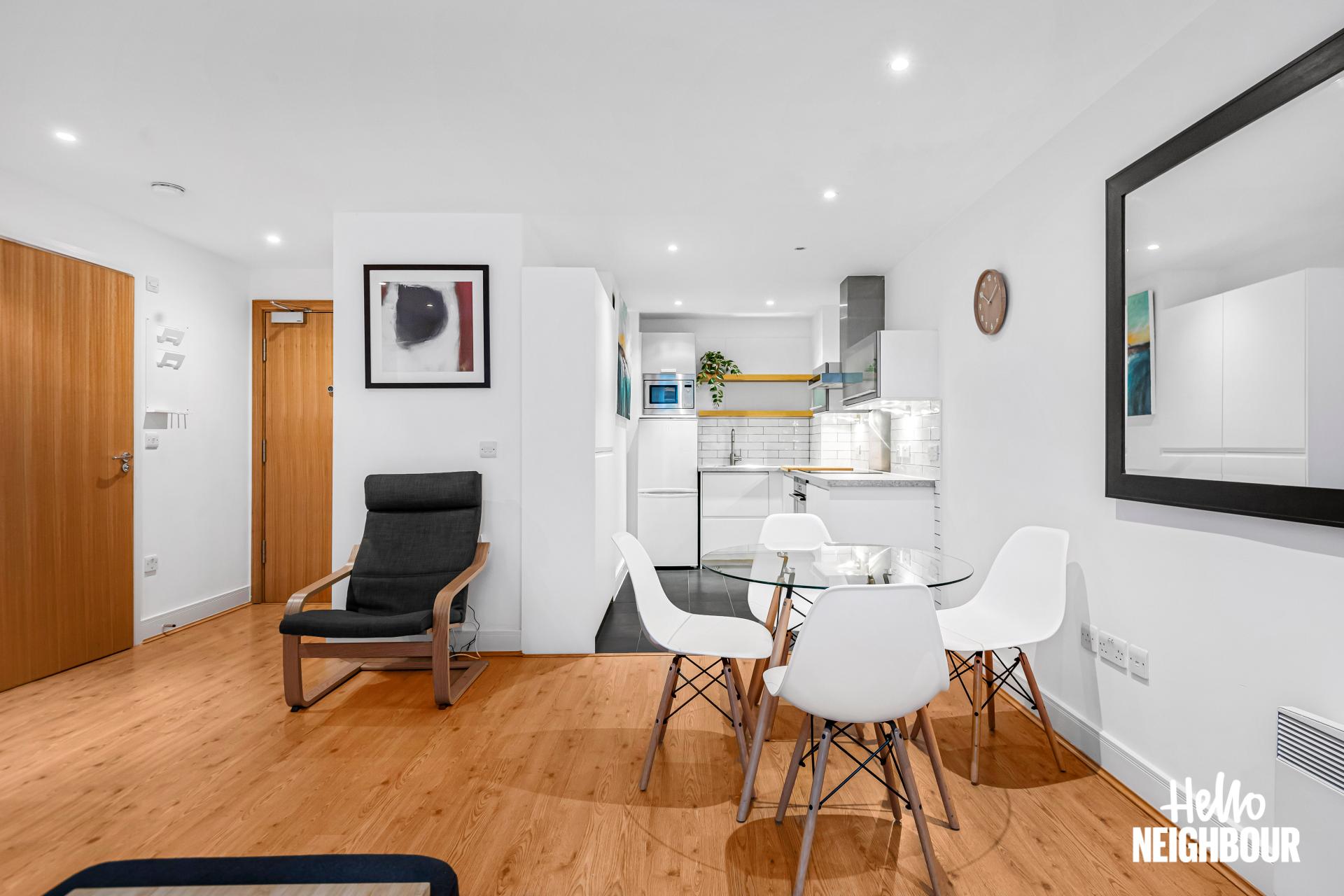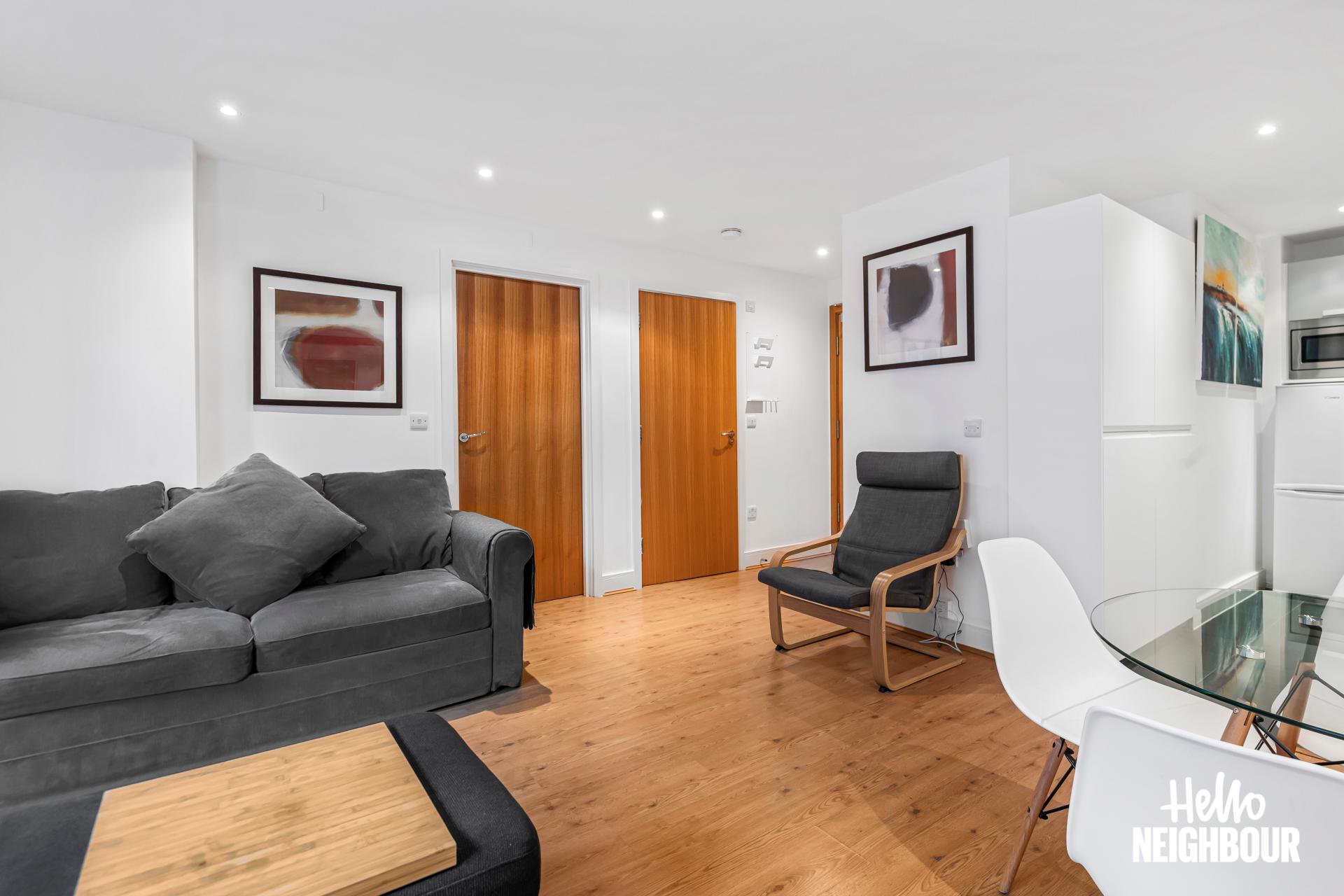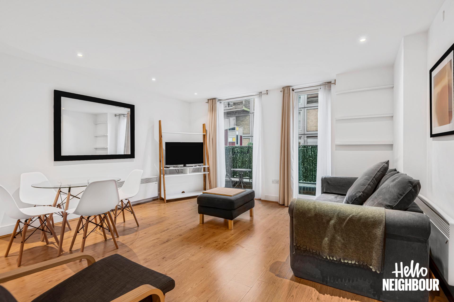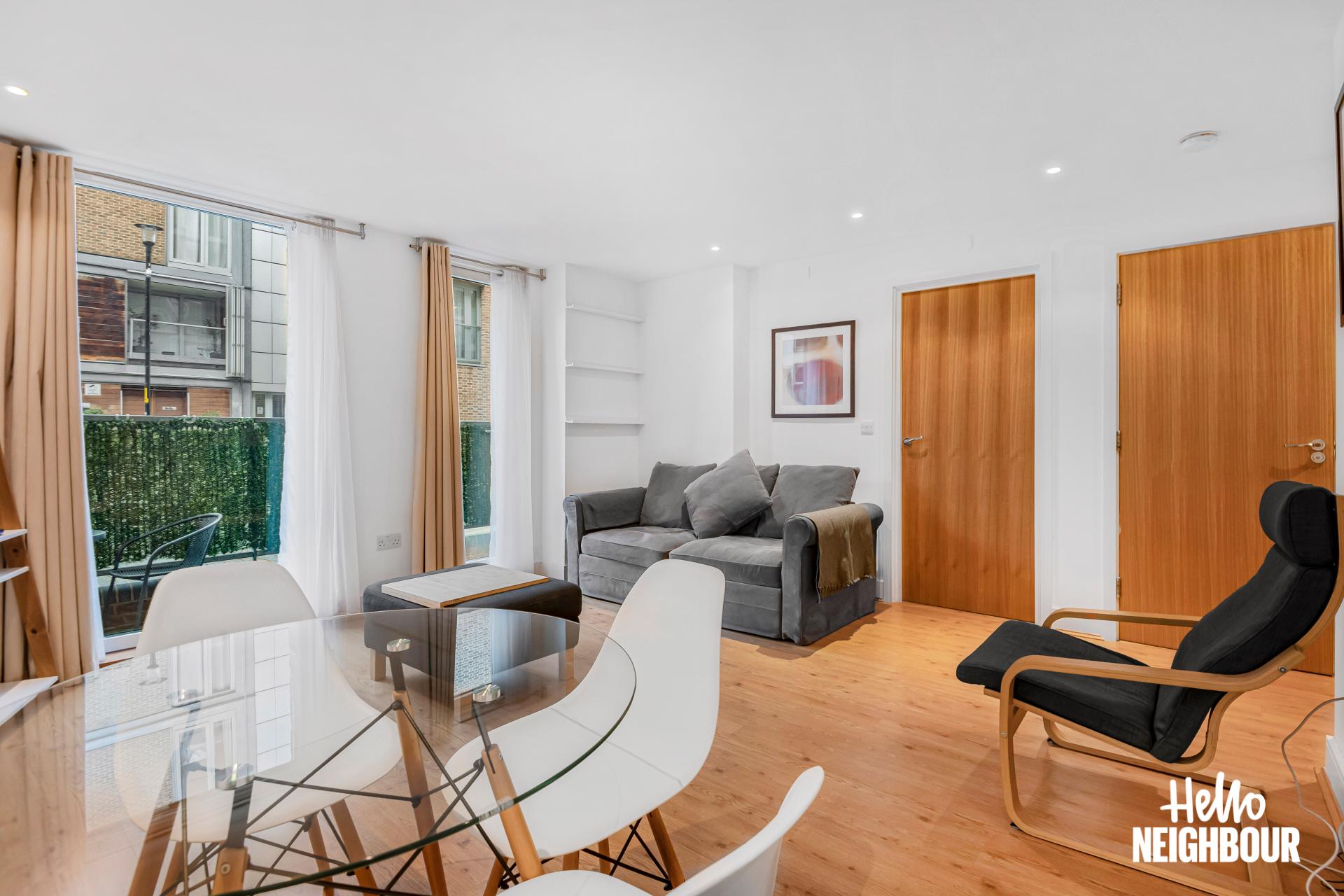 Hello Neighbour are proud to present this bright and well presented 1-bedroom apartment in Axis Court, SE16.\n\nThe property features a spacious open-plan reception area with large windows and direct access to a private terrace, allowing for plenty of natural light and a comfortable indoor-outdoor flow. The modern kitchen is neatly integrated into the living space and comes fully equipped with white goods, offering both style and practicality.\n\nThe bedroom is well sized and benefits from built-in wardrobes, providing ample storage while maintaining a clean and uncluttered feel. A contemporary bathroom with sleek tiling and a full-size bath completes the property.\n\nOffered furnished, this home is ready to move into and ideal for a single professional or couple looking for a well-connected and low-maintenance space.\n\nLocated in SE16, the property is within easy reach of local amenities including cafes, shops and green spaces, as well as convenient transport links for access into Central London.\n\nParking: None \nPets: Not accepted\n\nTo book a viewing: submit your enquiry and you'll receive an email and SMS detailing availability - within 10 min